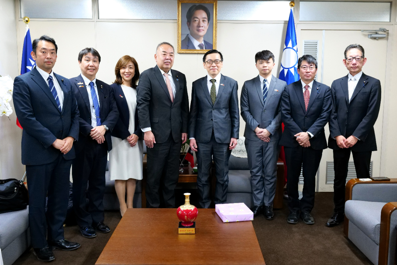 圖說一:范振國處長(右四)與「寒川日台友好議員連盟」會長杉崎隆之(左四)、副會長茂内久代(左三)、事務局長橋本修一(左二)、福岡正也(左一)、馬谷原光織(右二)、廣田淳生(右一)等議員合影,本處邱坤隆秘書(右三)陪同。