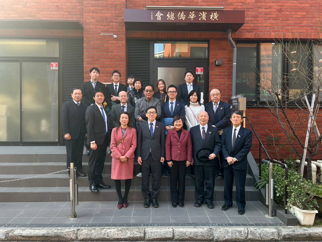 前三:本處范振國處長(第一排左二)陪同徐佳青委員長(第一排左三)及橫濱僑領於橫濱華僑總會前合影。