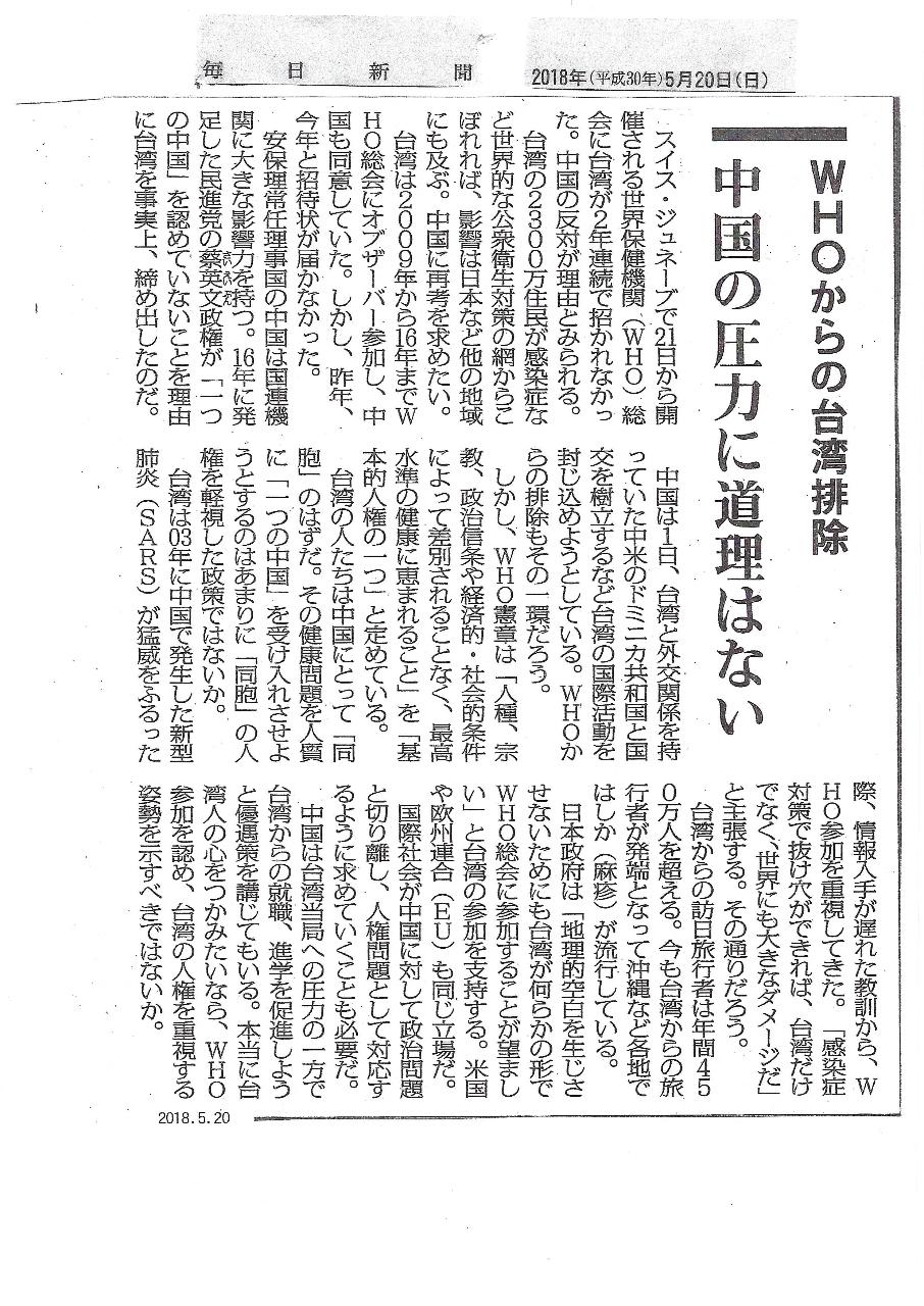 WHOからの台湾排除、中国の圧力に道理はない(毎日新聞2018.05.20)