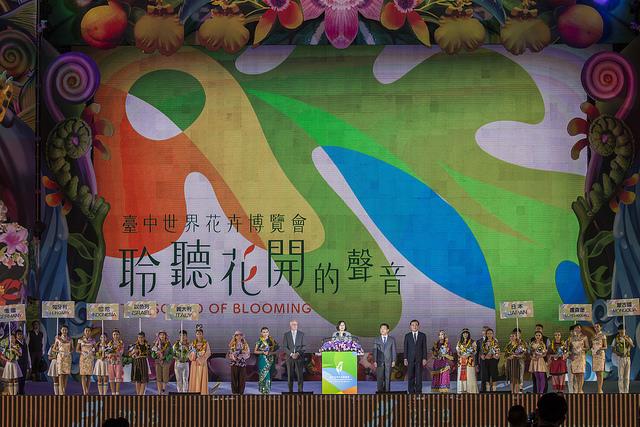 台中フローラ世界博覧会(中国語は台中世界花卉博覧会。台湾中部・台中市)が3日に開幕した。初日の入場者は延べ5万人を突破した。写真は壇上で祝辞を述べる蔡英文総統(壇上の女性)。(総統府サイトより)