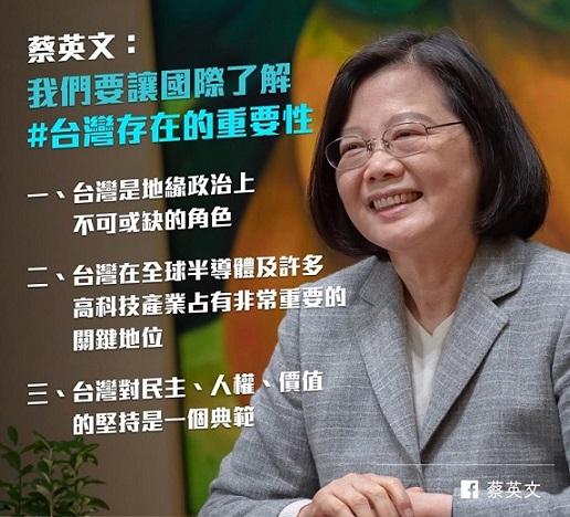 蔡英文総統は2月28日、日本の産経新聞のインタビューに応じ、台湾海峡両岸関係、台米関係、台日関係などを語ると共に、台湾の重要性を全世界に伝えていく考えを示した。(蔡英文総統のフェイスブックより)