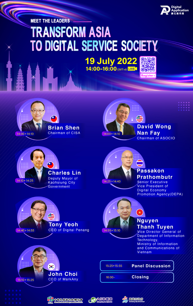 中華民國資訊軟體協會與亞太資訊服務業組織及高雄市政府將於7月19日舉辦"Transform Asia to Digital Service Society" 國際論壇,邀請台灣及印大區域專家分享資訊科技落地應用的觀點與經驗。