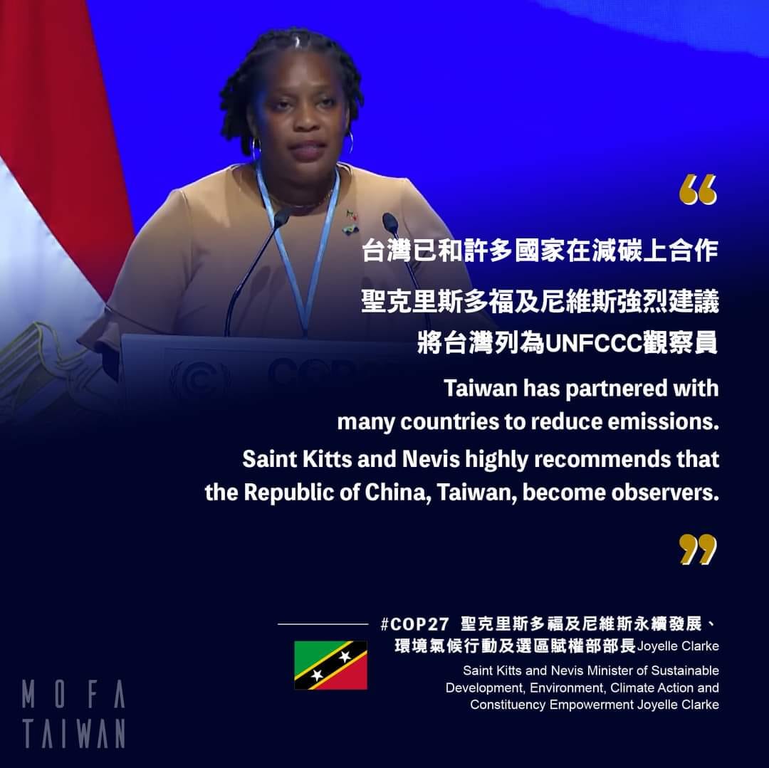 克國環境部長 Joyelle Clarke 在聯合國氣候變化綱要公約第27屆締約方大會發言支持台灣。Clarke 部長指出,台灣已經與許多國家在減碳上合作,克國強烈建議將台灣列為 UNFCCC 觀察員。