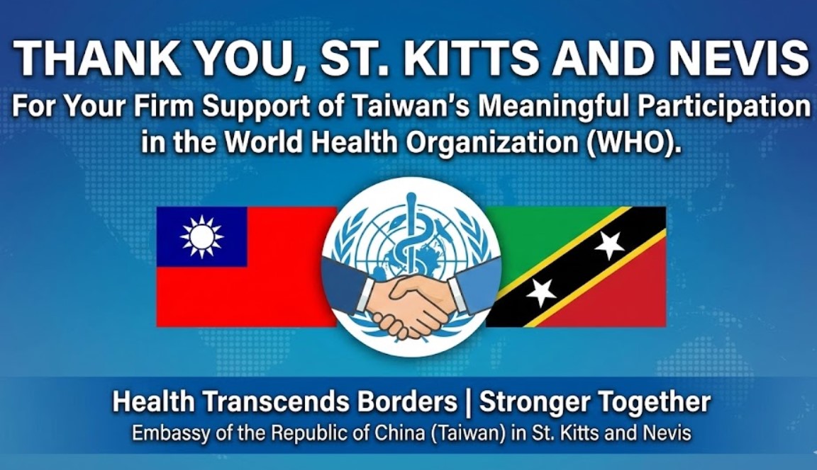 聖克里斯多福及尼維斯聯邦政府於 2026 年 2 月 2 日發布正式聲明,重申支持台灣參與「世界衛生組織」(WHO),並特別針對即將舉行的第 158 屆執行委員會(EB)表達力挺之意,本館謹代表中華民國(台灣)政府及人民表達最誠摯的謝意。