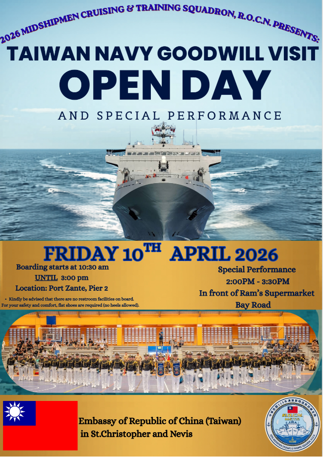 中華民國(台灣)海軍敦睦遠航訓練支隊將於4月10日(星期五)上午10時30分至下午3時,在克國免稅港 Port Zante 2號碼頭開放克國民眾登艦參觀,與官兵互動交流,近距離體驗台灣海軍訓練成果,並瞭解台灣在社會及科技發展方面的成就。