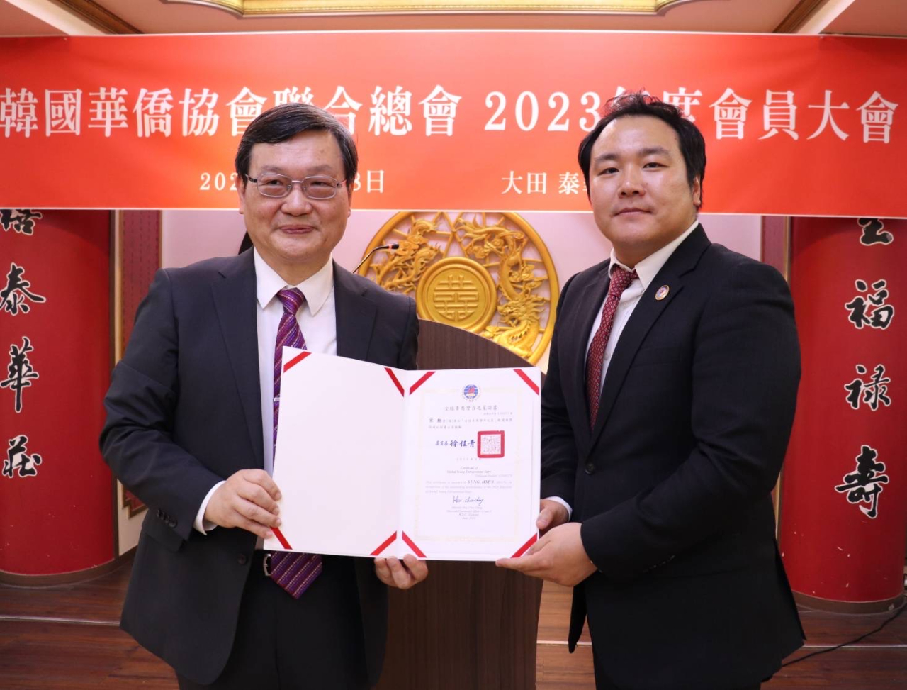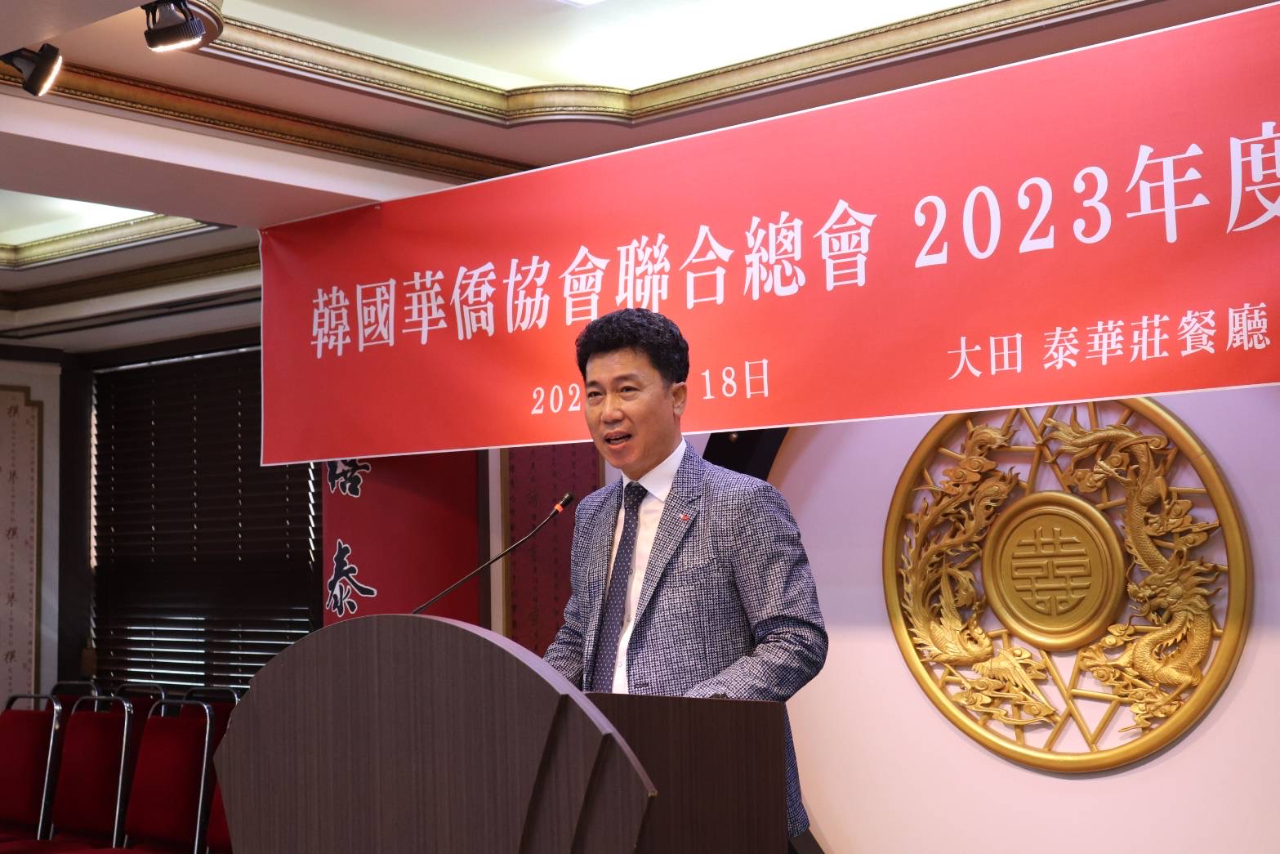 首先先恭喜我們韓國華僑聯合總會2023年度會員總會大會圓滿成功,剛聽到總會長向大家報告大會經過,也聽到梁大使對總會的肯定及支持,表示我們總會對於僑心團結華僑、為僑服務,獲得肯定。