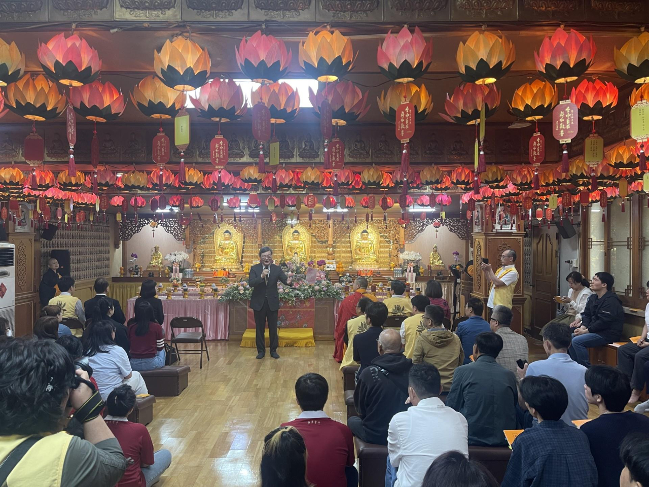 首爾佛光山寺為紀念釋迦牟尼佛誕,於5月15日(農曆4月8日)上午10時30分舉行浴佛法會,由首爾佛光山寺住持慧豪法師主持,駐韓國台北代表部梁光中代表伉儷偕同行政組江嘉祥組長參加,約有信眾100多人出席,藉由十方信眾齊聚佛前凝聚祥和力量,一起浴佛淨化身心,同霑法喜。