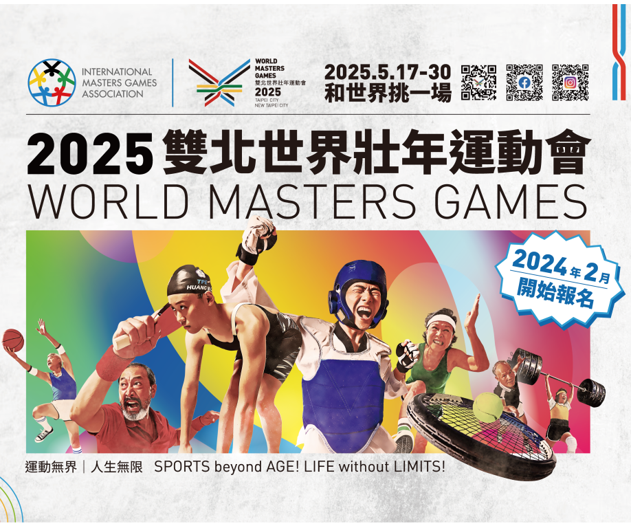 2025雙北世界壯年運動會是臺北市及新北市共同主辦的國際大型綜合性運動賽會,將於2025年5月17至30日舉行,賽會共有35種運動種類其中並包含帕拉運動組別,只要年滿30歲,無需選拔,皆可報名參賽。2024年2月開放報名,等你一起來和世界挑一場!