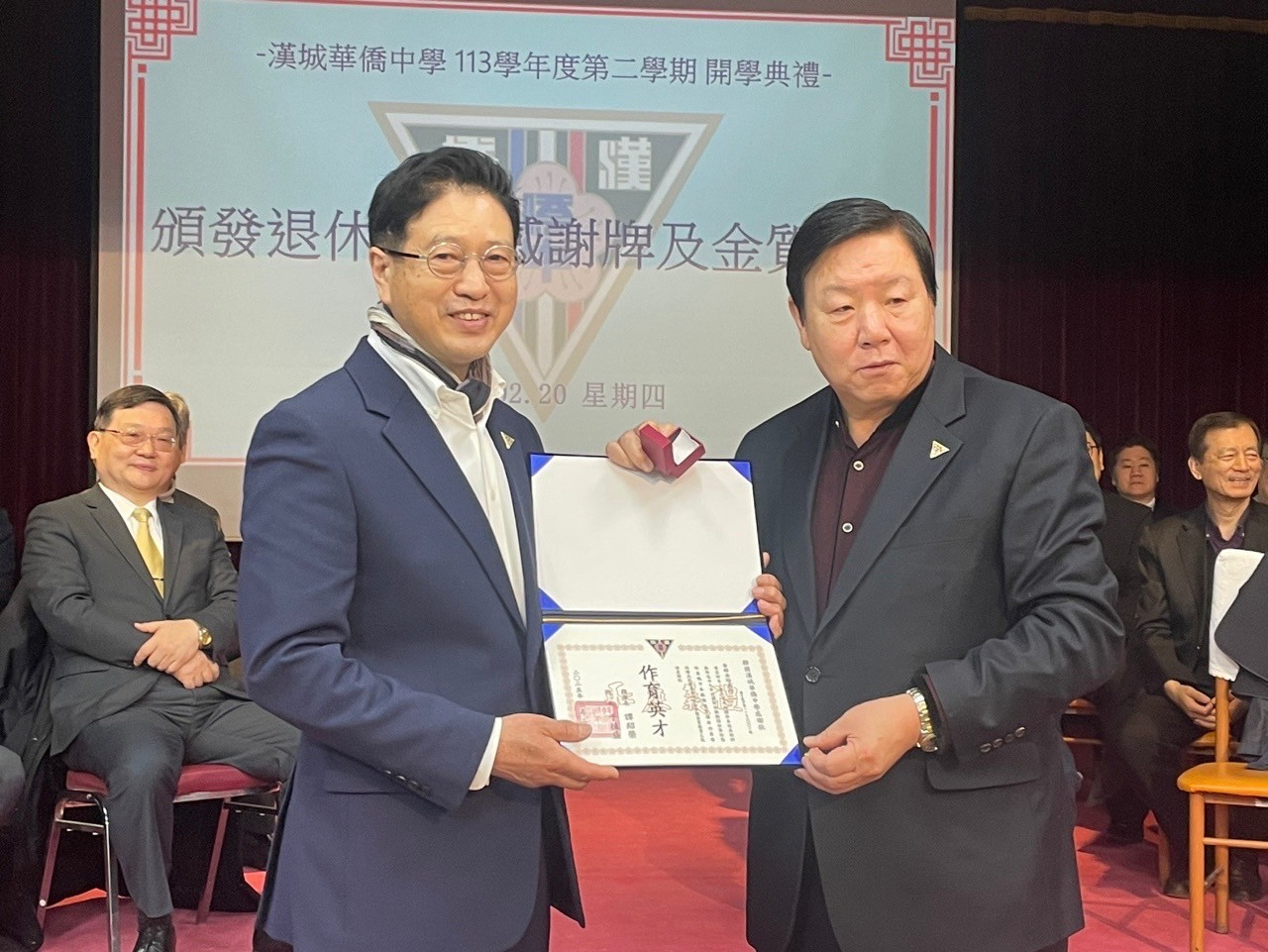 漢城華僑中學理事會理事長譚紹榮頒贈感謝狀予退休教師黃群