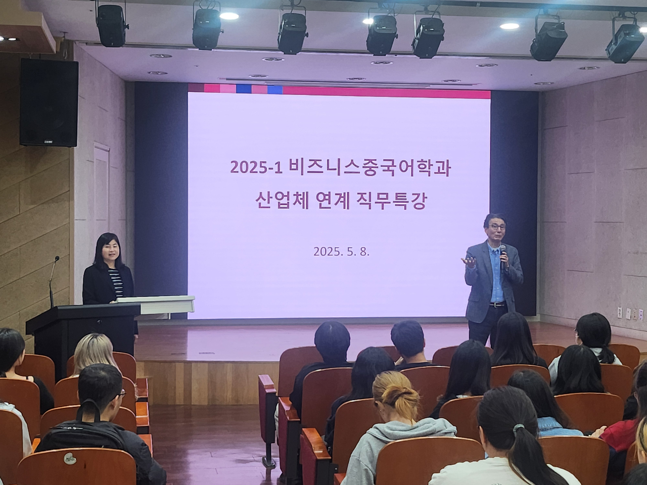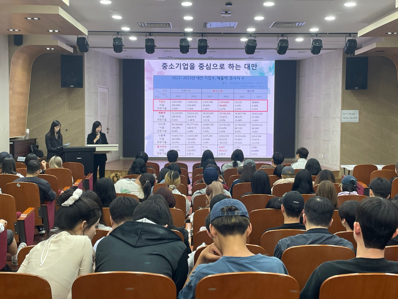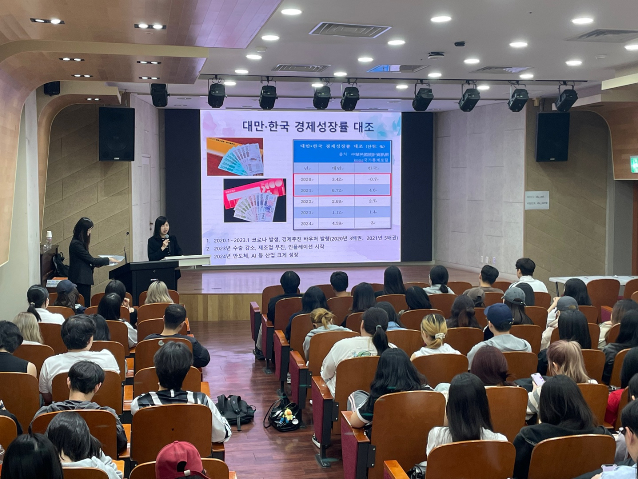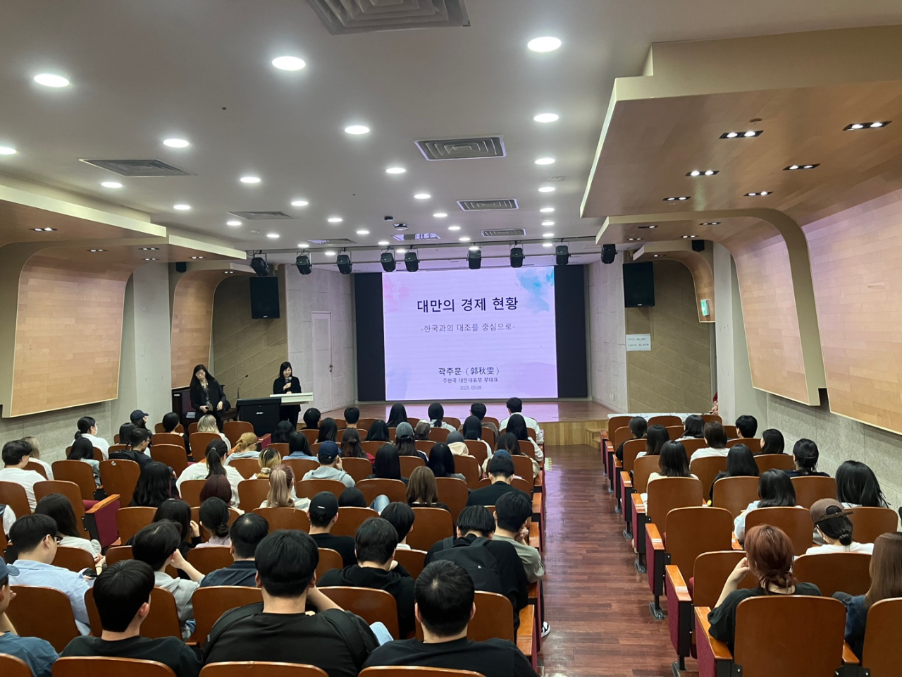 本次活動由該校中文系金鎮永系主任的介紹下開啟序幕,金教授介紹郭副代表赴任前任教於國立政治大學擔任教授及學務長職務,學術及行政背景豐富。郭副代表演講時,輕鬆的問答方式點出大家所認識的臺灣,再逐一介紹臺灣的行政、歷史及多元文化背景概況,並深入說明臺灣經濟情形,同時與韓國作比較,以淺顯易懂的方式,讓學生對臺灣經濟情形留下深刻印象。最後,郭副代表就學生們關切的未來職涯問題,說明目前業界要求A型人才,期許並鼓勵學生在校期間,修習兩個以上專業領域,具備融合性思考、包容態度及國際視野與國際移動力,將有助未來個人職涯的發展。