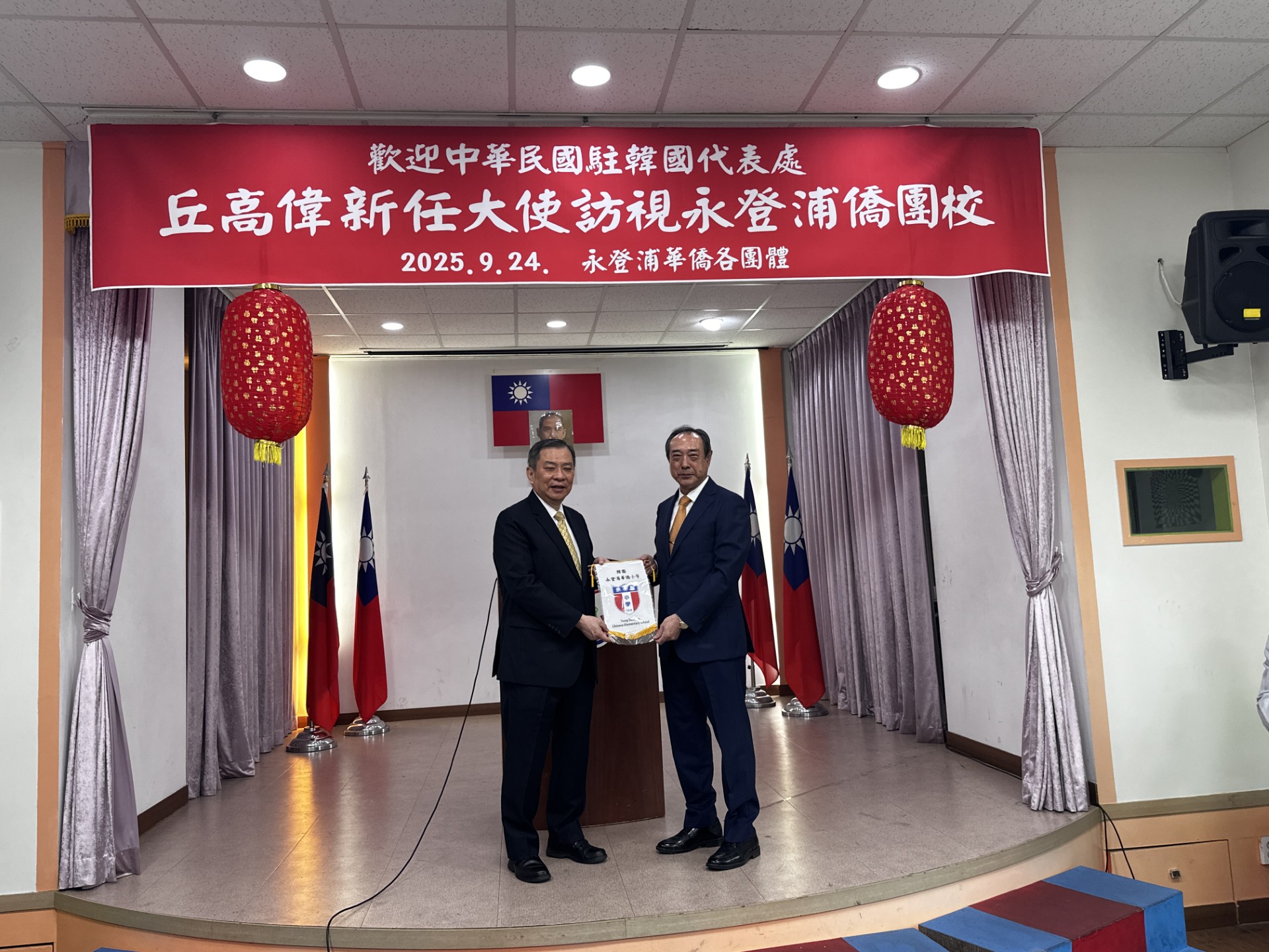 丘高偉代表致詞中提及自己外交生涯首派釜山,當時就對韓國華僑社會堅毅支持中華民國留下深刻印象!經歷三十多年因緣際會再次回到韓國服務,期盼與各地僑團校齊心合作,為韓國僑民創建更美好的未來。因應9月28日教師節即將到來,他也致贈臺灣風味禮品,以感謝永登浦華僑小學教師長年辛勞,讓正體華文教育在韓國札根。