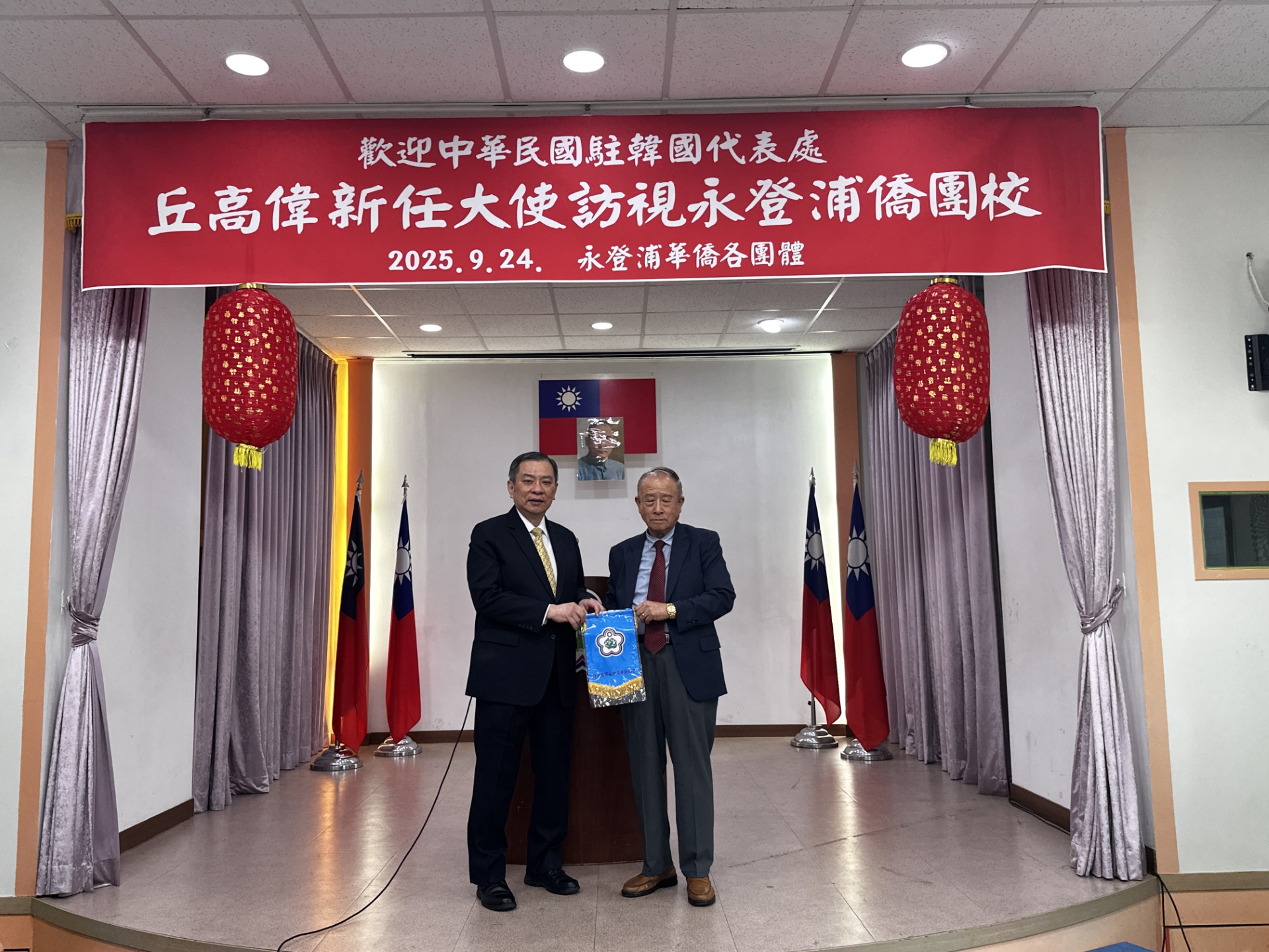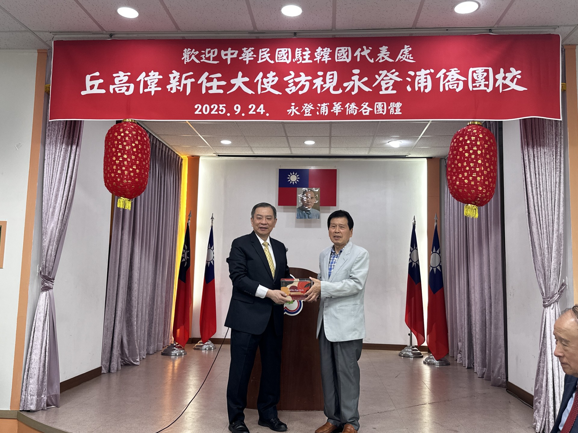 駐韓國代表處代表丘高偉於9月24日上午在僑務組副組長杜慧音陪同下拜會永登浦僑界,永登浦華僑協會會長喬聚東、首席副會長崔同鎰、理事王忠仁、永登浦華僑小學劉家棟董事長、劉昌萬常務董事、秦嗣義校長、永登浦僑民服務委員會常務委員張永林,以及國際韓國華僑志工會會長成益昌等僑界代表熱烈迎接,表達永登浦僑界對丘代表的熱烈歡迎。