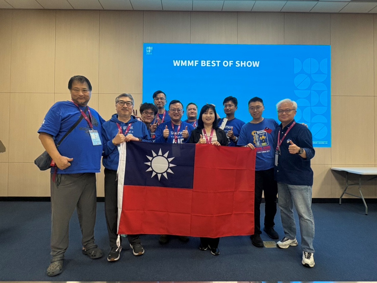 2025世界軍事模型展覽會(WMMF2025) 10月12日於韓國戰爭紀念館(War Memorial of Korea)舉行頒獎典禮,駐韓國代表處郭副代表秋雯偕同仁到場為我隊加油打氣,並與賽團選手持我大型國旗祝賀旗開得勝。