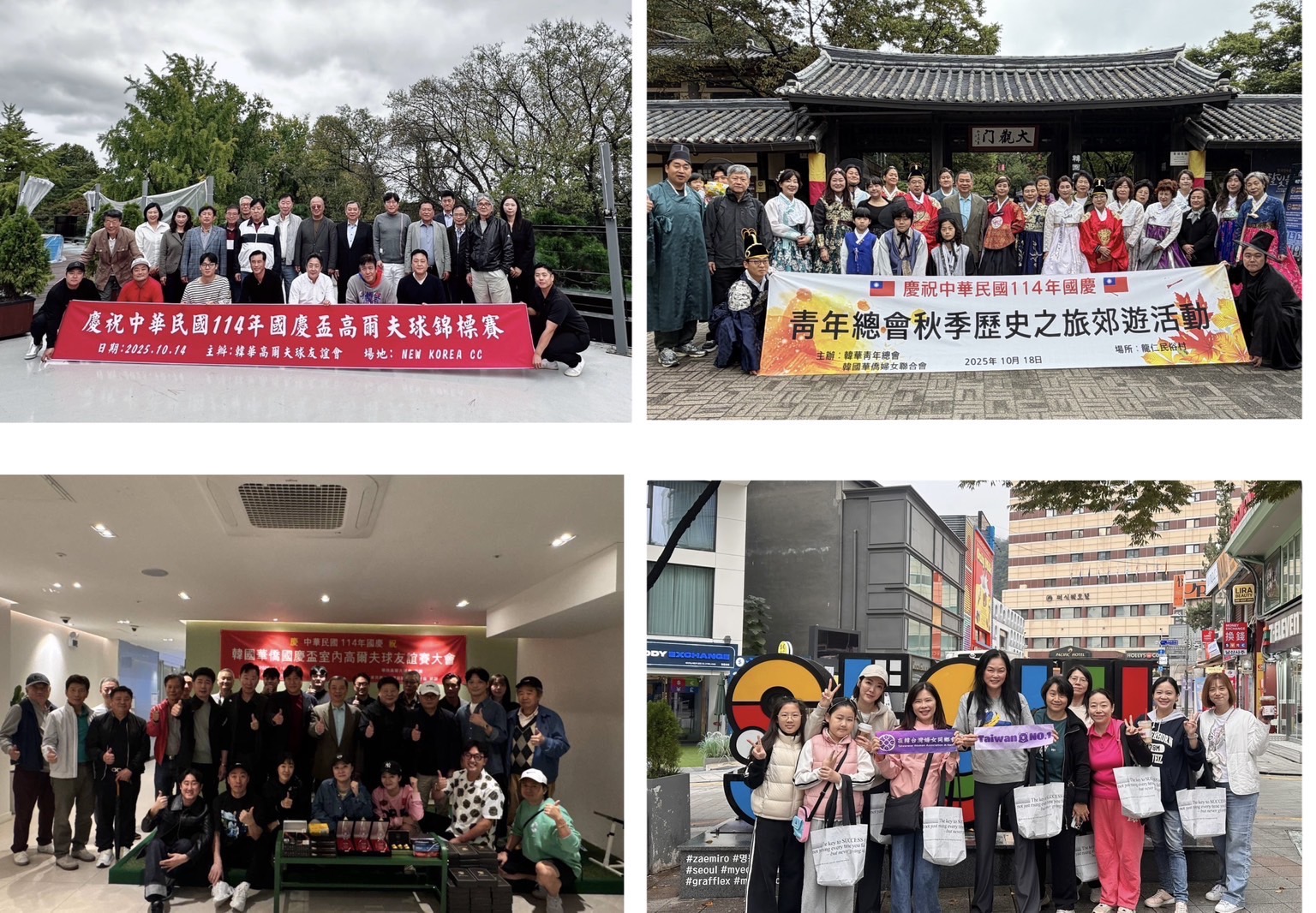韓國華僑協會聯合總會青年會接力於10月18日由會長何紹榮帶領,前往龍仁民俗村進行國慶秋遊活動,韓國華僑婦女聯合會亦由會長劉美珍率團一同參與,計約40位會員共慶雙十。是日下午華新高爾夫球會舉辦國慶盃室內高爾夫球賽,韓華青年以流行的運動方式來慶祝國慶,丘高偉代表於兩場活動中均表示感謝僑團熱烈舉辦國慶活動,同時勉勵所有韓華青年持續積極服務僑社,展現韓華僑界嶄新風貌。