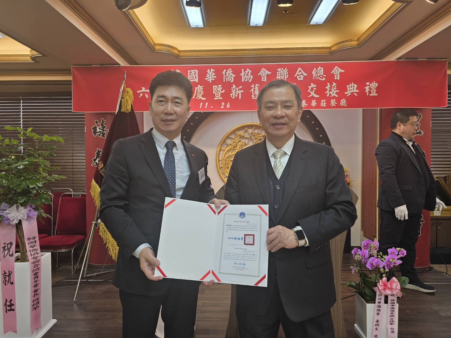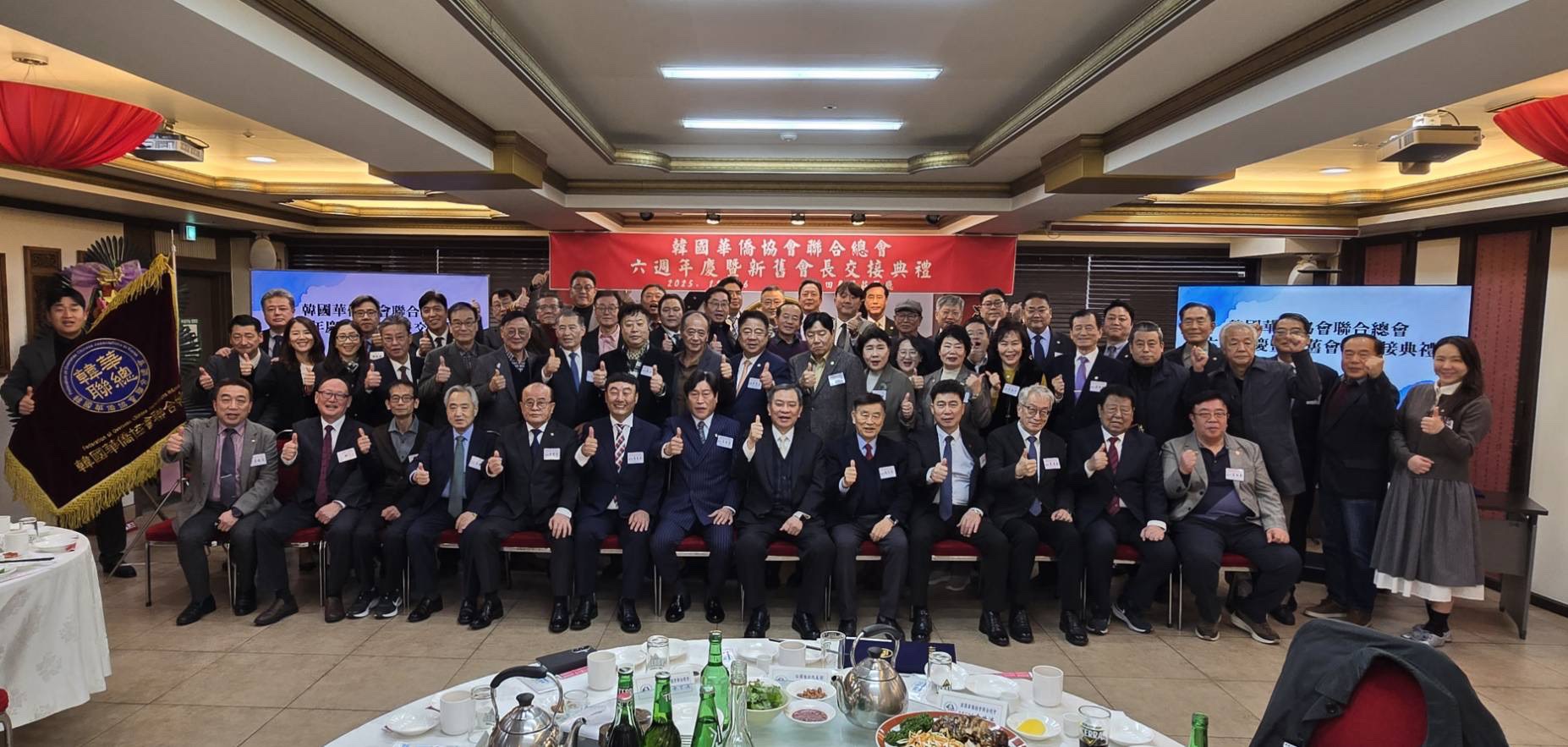 韓國華僑協會聯合總會11 月 26 日假大田泰華莊舉行「成立六週年暨第三屆會長交接就任典禮」,典禮上,第二屆會長孫毓緒正式將重責大任移交給新任第三屆會長李中漢,駐韓國代表處代表丘高偉在行政組組長江嘉祥的陪同下應邀出席,僑務委員會委員長徐佳青特別錄製影片致上祝賀,期許總會能承先啟後,持續發揮整合僑社的關鍵作用。當日來自韓國各地僑團代表近 70 位僑領齊聚一堂,氣氛熱絡溫馨,充分展現出韓華團結一心的新氣象。