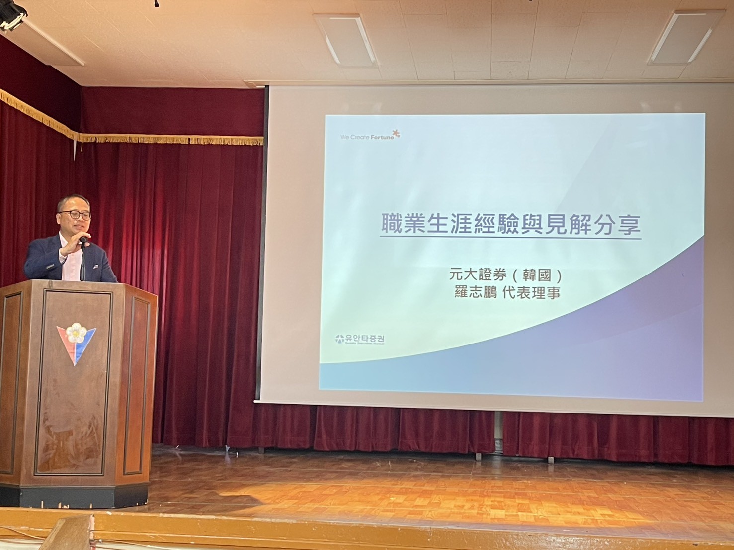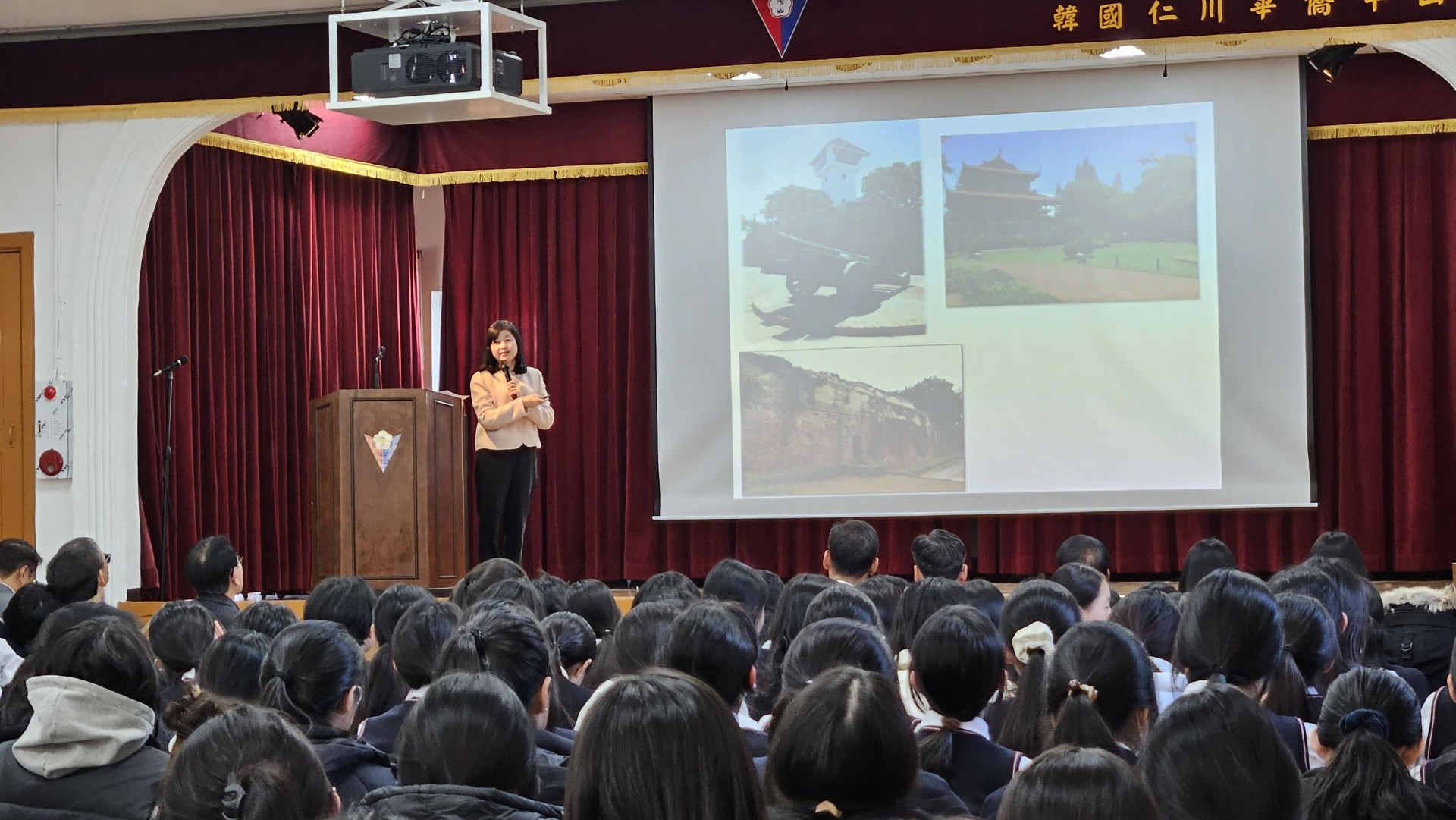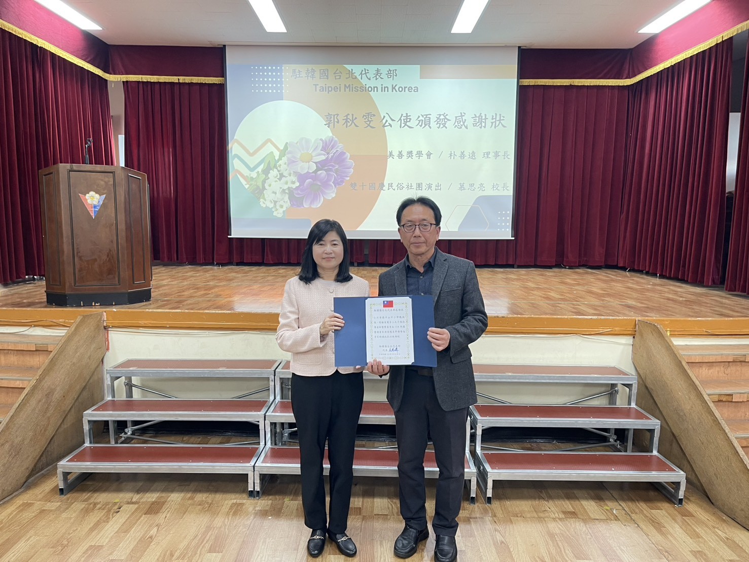在捐贈儀式後,接續進行二場精彩的專題分享,羅志鵬總經理以其豐富的職場經驗,分享了「職業生涯經驗與見解」,鼓勵學生提早規劃未來方向,為學子帶來豐富的啟發;郭秋雯副代表則深入淺出地演講「多元的臺灣歷史與文化」,讓現場學生對臺灣的多樣且豐富面貌有更深刻的認識,她更期許學生善用韓語優勢協助推廣臺灣,會中她並代表丘高偉代表頒發雙十國慶酒會活動表演感謝狀予仁川僑校,以及頒發感謝狀予美善獎學會朴善遠理事長,感謝其對僑校的支援與協助。