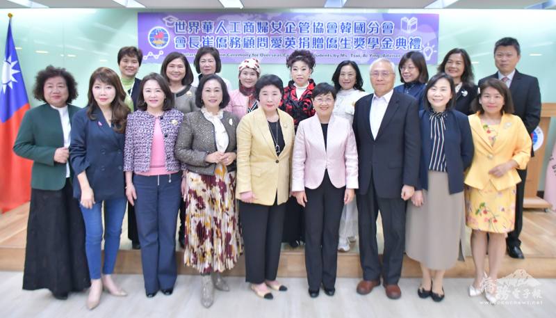 世界華人工商婦女企管協會韓國分會會長崔愛英僑務顧問捐輸僑委會獎助學金新臺幣100萬元,由僑委會委員長徐佳青代表接受