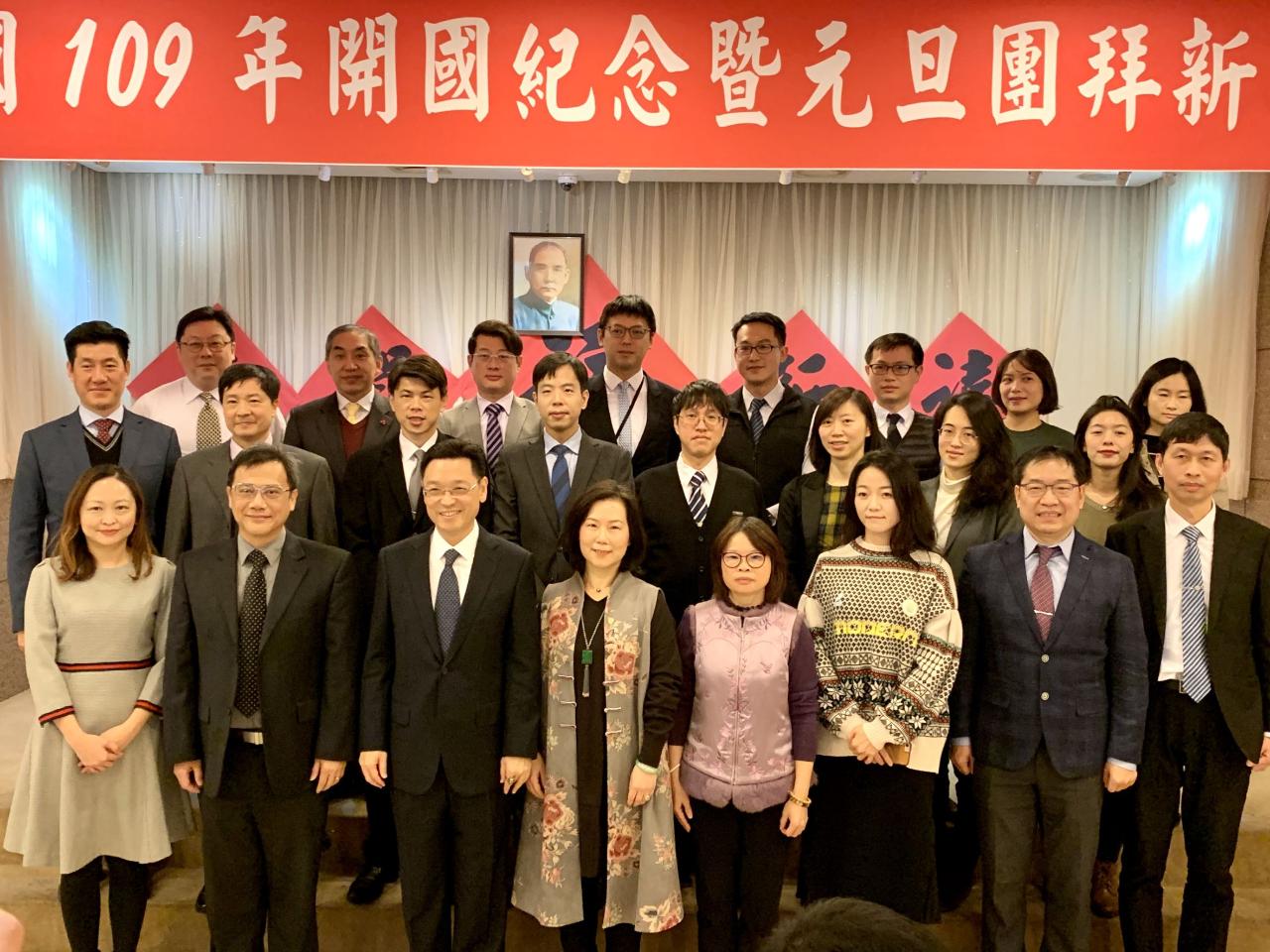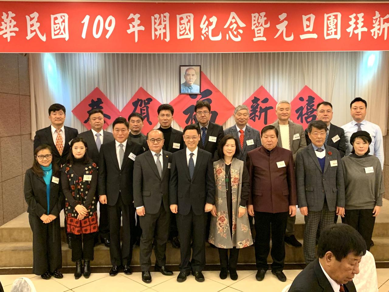 駐韓國代表處代表唐殿文偕同夫人張曉霞及駐處同仁1月1日上午和以漢城華僑協會會長李寶禮為首的全韓各僑區華僑代表約200人,在首爾東寶城舉行中華民國開國109年元旦團拜,祈願中華民國國運昌隆。