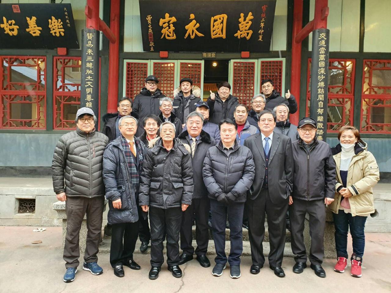 駐韓國代表處代表唐殿文(前排右五)偕夫人張曉霞(前排右六)與漢城華僑協會會長李寶禮(前排左四)會長團向大家拜年