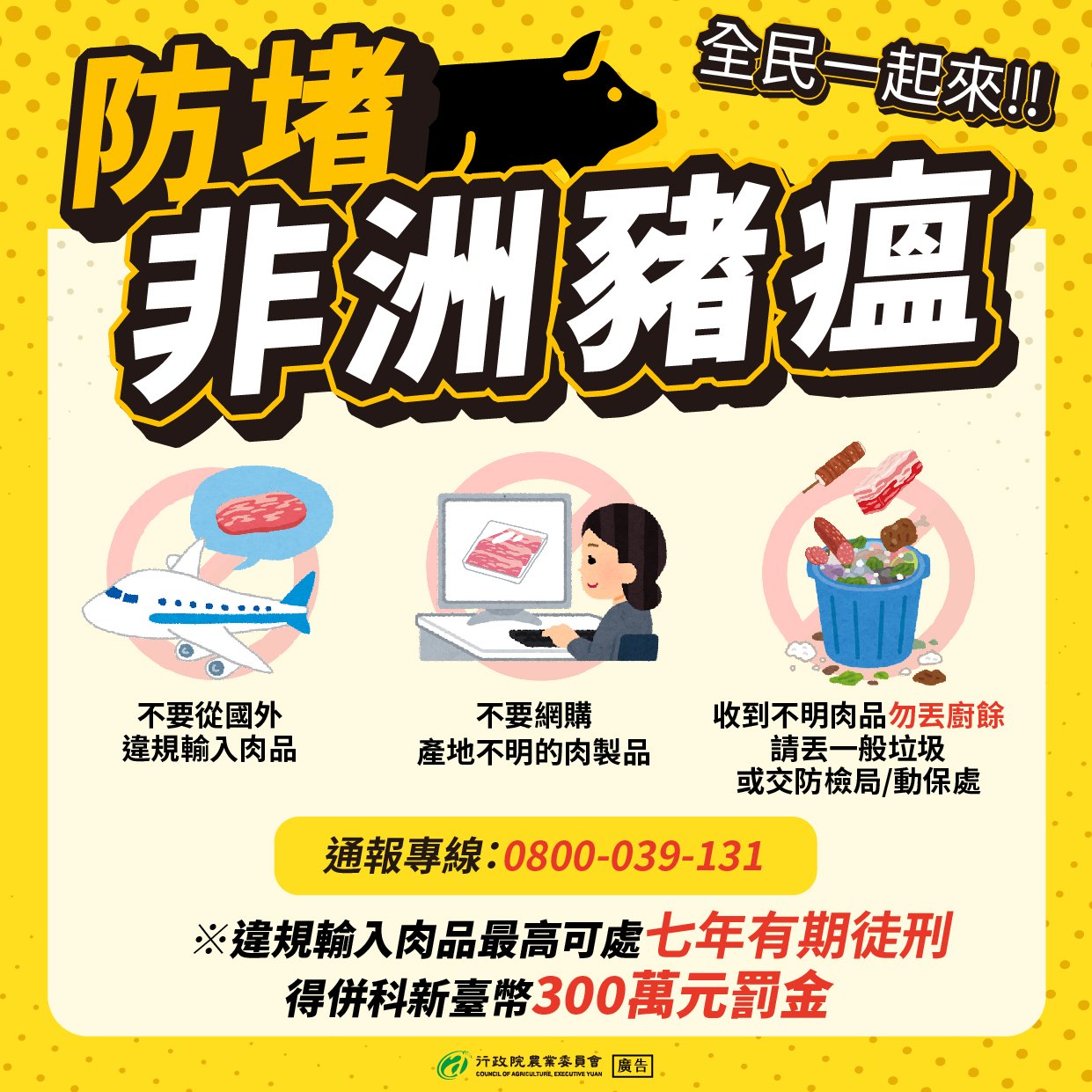 為落實國邊境檢疫,請民眾入境臺灣時勿攜帶或以快遞及郵包寄送豬肉產品及含肉月餅等檢疫物。