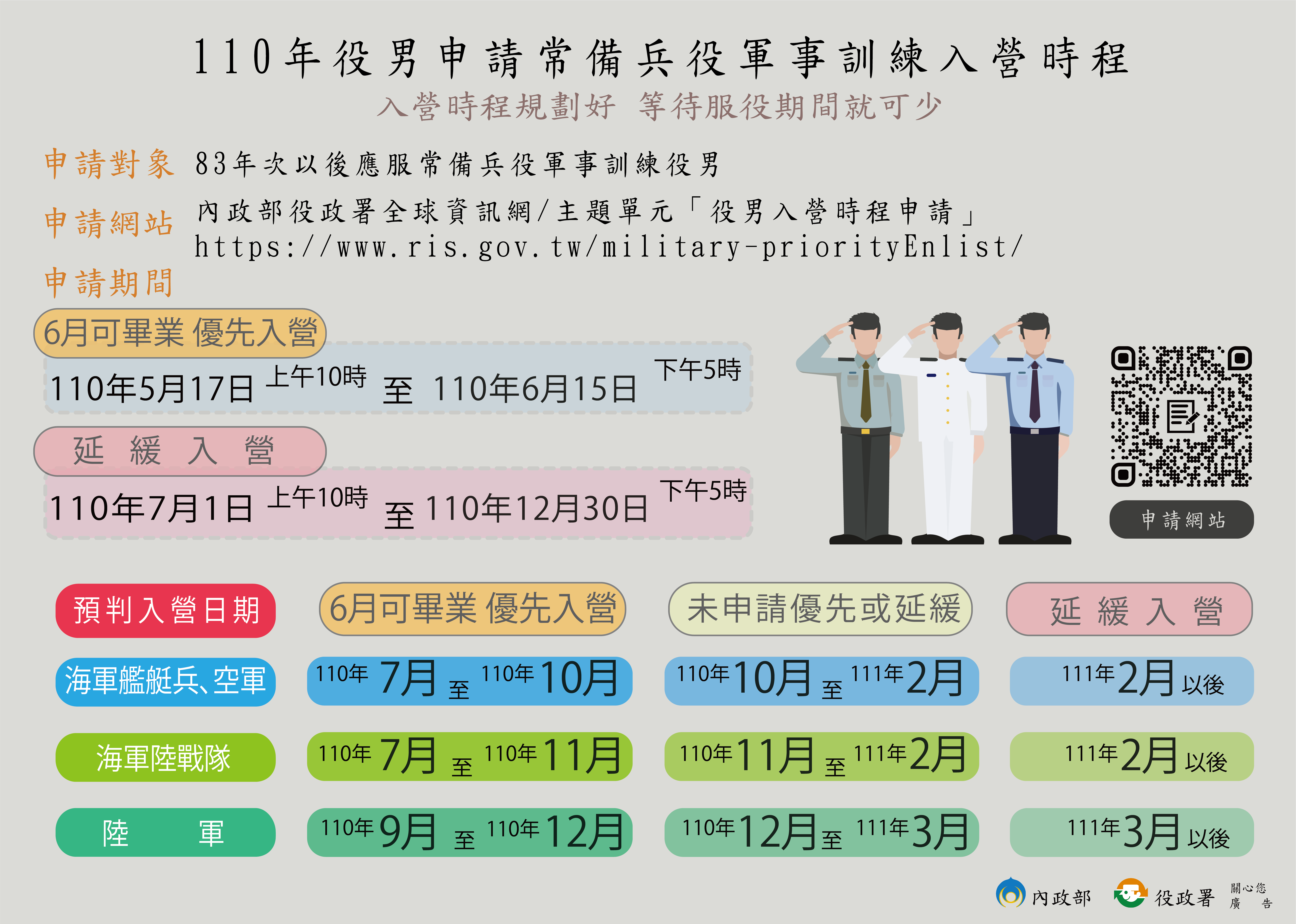 110年役男常備兵役軍事訓練入營時程須知