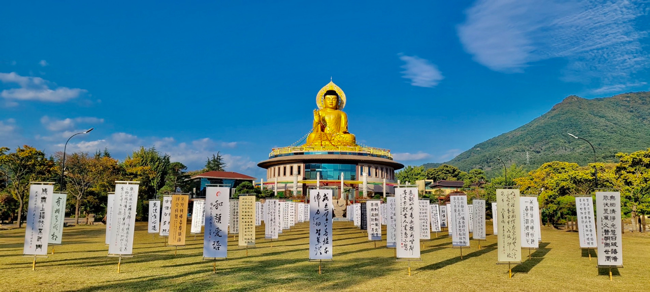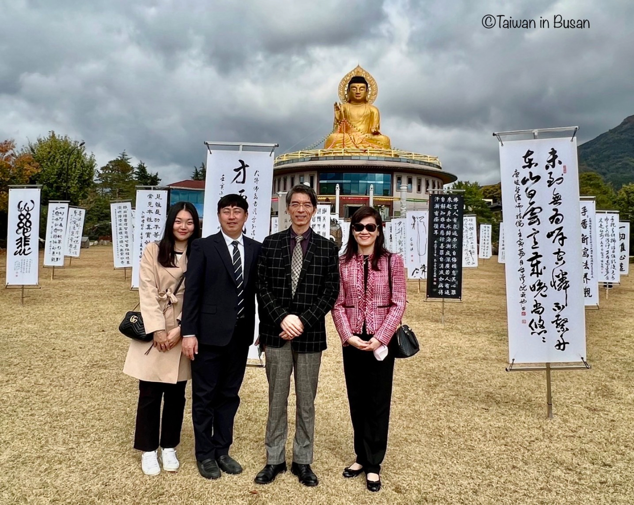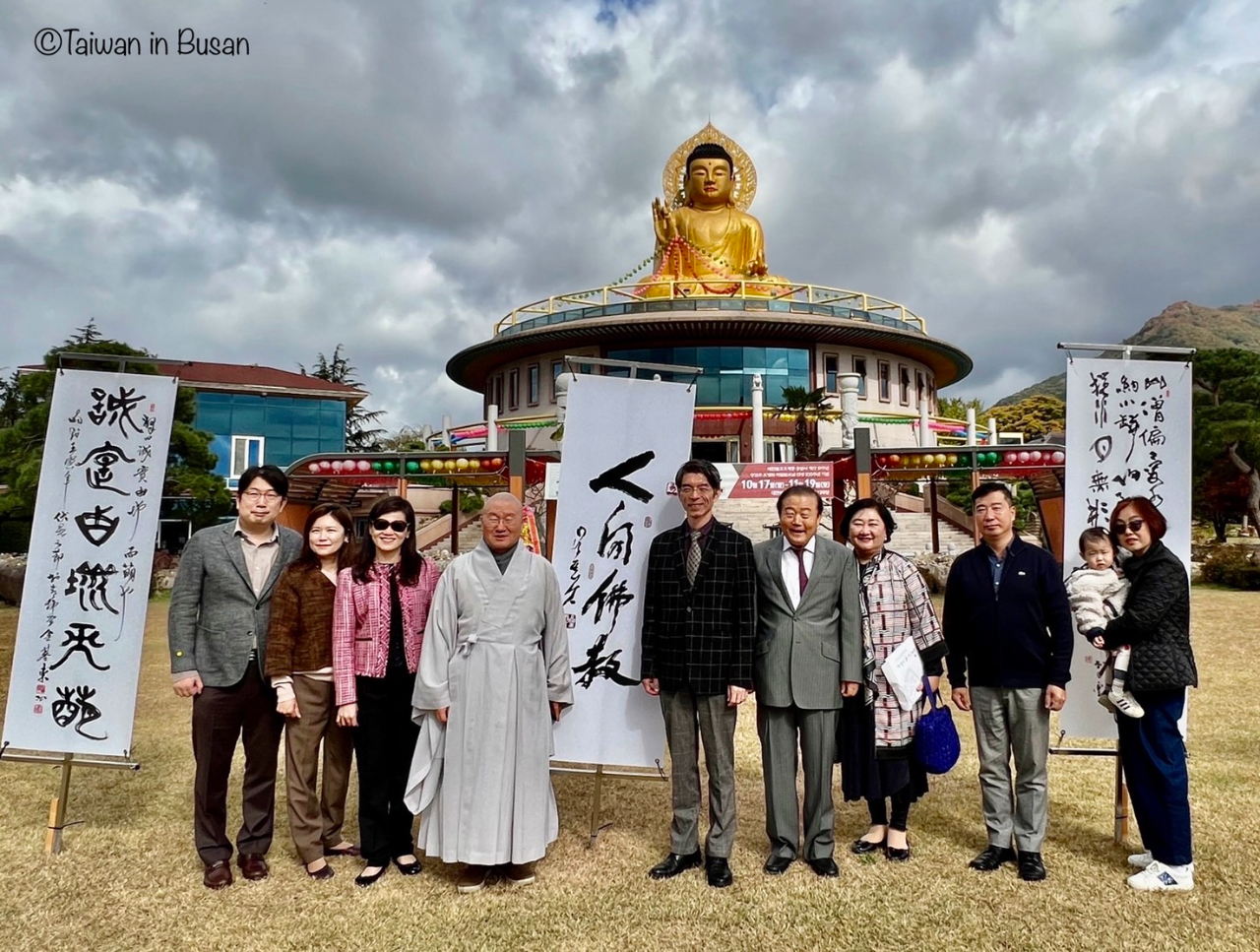 10月30日,本處林處長夫婦偕同仁受邀出席釜山弘法寺主辦的《釜山書畫108人邀請展─韓臺國際書藝交流展》開幕典禮,欣賞來自台灣54位、韓國54位共108名書法家的揮毫作品,以及台灣最大佛教聖地之一佛光山寺開山始祖星雲法師贈送的墨寶《人間佛教》,期許台韓關係及文化交流能夠持續順遂發展。 今年時逢大韓佛教曹溪宗弘法寺開山19週年、創建主河道明華菩薩冥誕100週年,弘法寺特別舉辦台韓書藝交流展,並延續去年舉辦的《釜山書畫108人邀請展》,以期佛法遠播及世界和平。此次邀請釜山及韓國書藝團體總聯合會旗下著名書法家,以及台灣中國書法學會書法家盛大舉辦。擔任此次展覽執行總務的金尚智書法家也以作品《如蓮》參展。 展覽開幕儀式原訂於弘法寺前大草坪上舉行,並邀請書法家一同揮毫表演,但因遇雨改於莊嚴的大雄寶殿內從簡辦理。開幕典禮由弘法寺住持深山大師、林處長夫婦、國會議員白宗憲、金井區廳長金在允及區議長崔峯煥、韓國書藝團體總聯合會會長金聖在、釜山華僑協會副會長叢培錦夫婦、慶州華僑協會副會長高祿財等來賓,以及書法家們等逾一百人參與,場面隆重。 林處長致詞時除祝賀展覽順利、期許台韓未來在佛法及書藝持續深化交流,並代表中華民國政府就10/29發生在首爾梨泰院的不幸意外事件,向韓國政府和人民表達深切哀悼與慰問。金井區廳長金在允回應表示,本週全國哀悼期間取消一切慶典活動;國會議員白宗憲則允諾督促政府致力救助傷患,並深刻通盤檢討,以免再重蹈覆轍。深山住持則表示,在哀悼期間舉辦此活動,心情複雜,願逝者安息、傷者康復,並希望能藉由書藝撫慰生者及罹難者家屬。 弘法寺屬於韓國佛教曹溪宗,同時也是台灣佛光山在釜山的分院,以擁有韓國最大的21公尺高坐佛像「金銅阿彌陀大佛」而馳名。寺院被金井山與鐵馬山環繞,並有水營江守護,呈現佛教經典中蓮華藏世界般的景色。今年是創建主河道明華菩薩冥誕100週年,於不久前的第32回虛空摩旨弘法波羅蜜祭中,也舉辦了紀念銅像揭幕儀式。 《釜山書畫108人邀請展─韓臺國際書藝交流展》,自10月17日起至11月19日在弘法寺戶外草地藝廊展出。各位朋友如果這段期間前往弘法寺虔誠佛禮時,可以順道欣賞書藝作品、陶冶情操、昇華心境。 Photo credit: 韓國佛教曹溪宗弘法寺