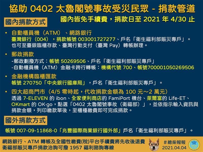 為回應民眾愛心及協助東臺灣「0402太魯閣號事故」受災民眾後續醫療、生活及社會重建相關費用,及提供罹難者家屬之經濟支持,我衛福部自即日起至110年4月30日(星期五)止,接受民眾捐款。