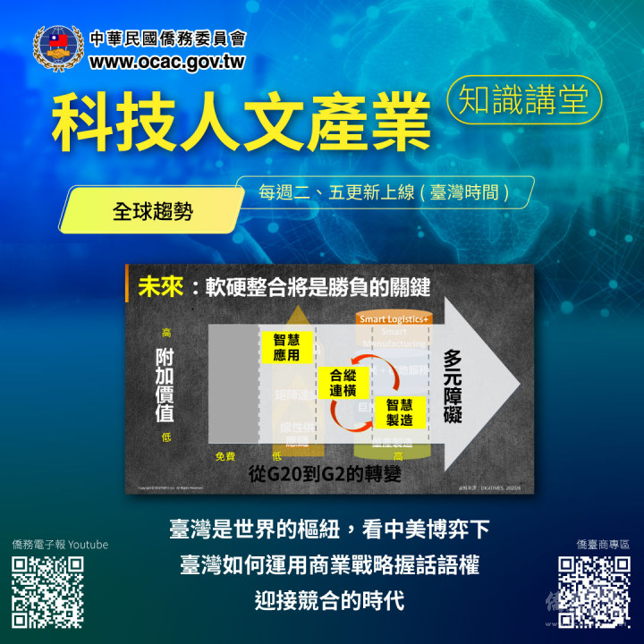 全球產業快速變化,到處充滿機會!我國僑委會鼓勵海外僑臺商善用「科技人文產業知識講堂」資訊,深入瞭解臺灣資源,運用多元靈活的商業策略,創造更多的價值與商機,迎接競合的時代。