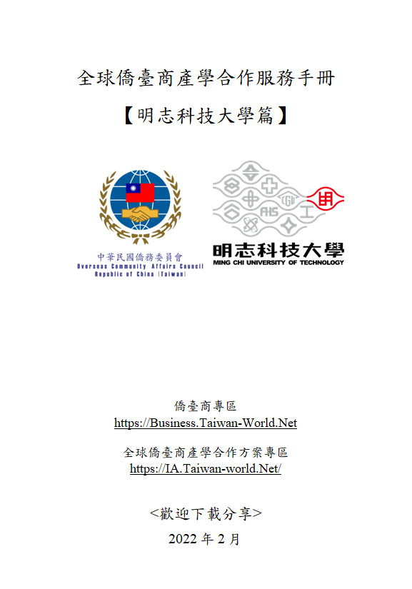 「全球僑臺商產學合作服務手冊【明志科技大學篇】」檔案已公告於(IA.Taiwan-World.Net)及僑委會官網「僑臺商專區」(https://Business.Taiwan-World.Net),另該校已建置「僑臺商專區」,歡迎僑臺商朋友免費下載參考運用並踴躍分享。