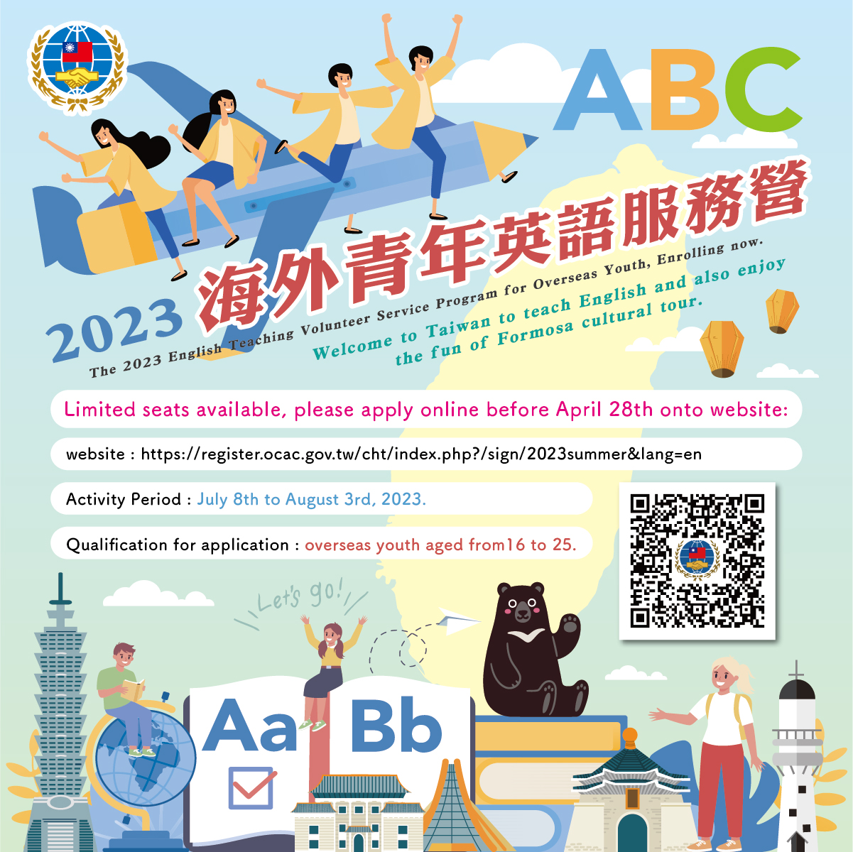 旨揭英語服務營報名至2023年4月28日截止,有興趣之海外青年敬請踴躍至「僑務活動報名系統」報名,網址: https://register.ocac.gov.tw/cht/index.php?/sign /2023summer。