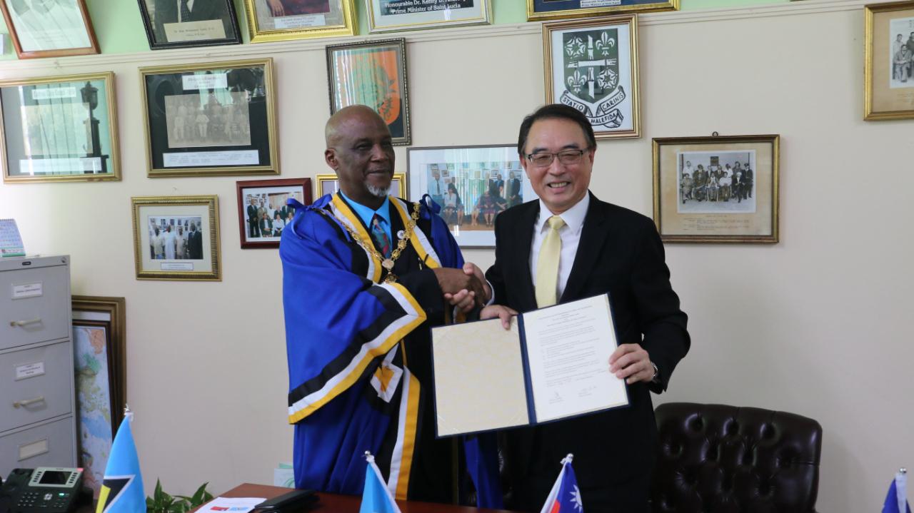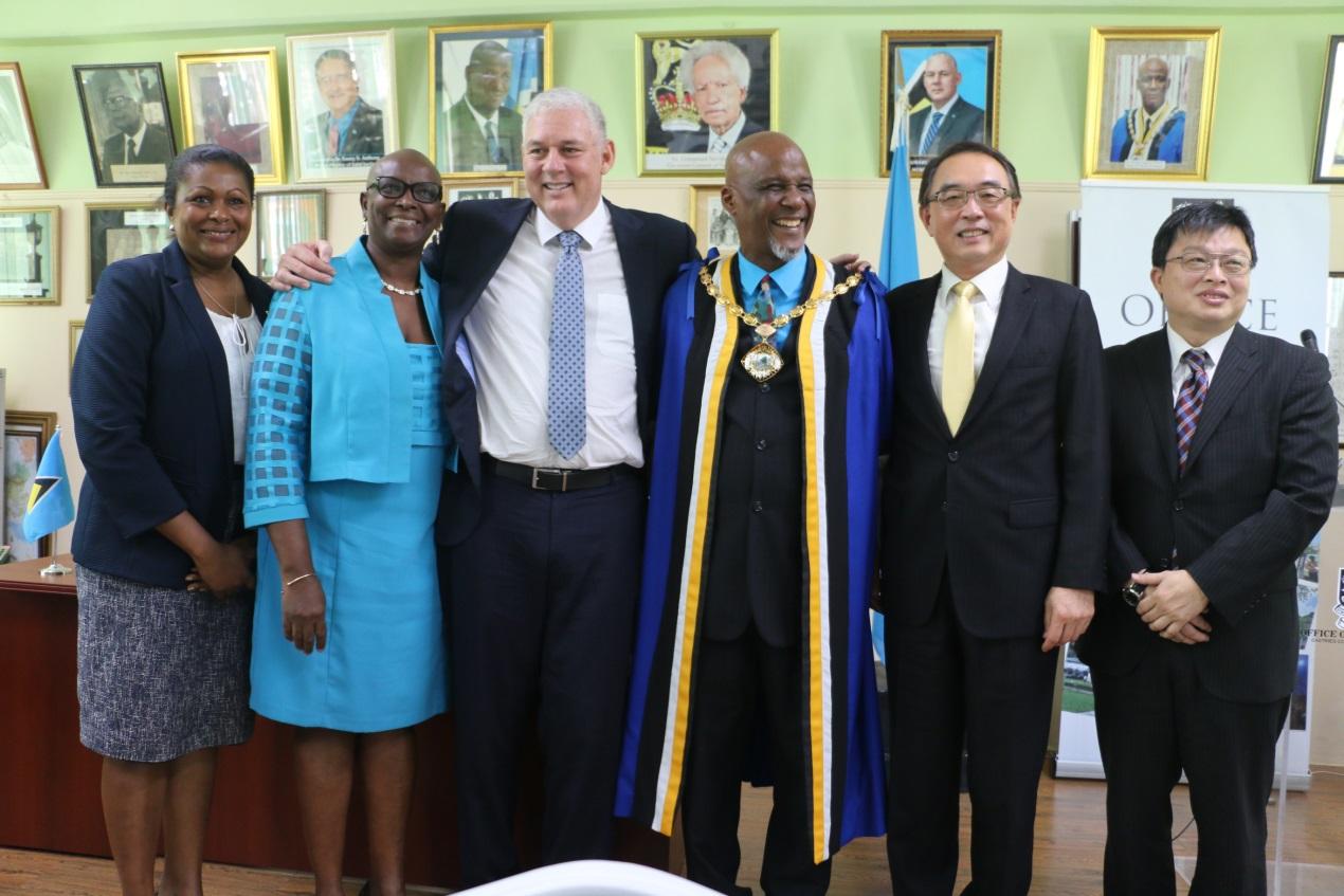 中華民國駐聖露西亞大使沈正宗代表台北市政府與露國首都卡斯翠(Castries)市法蘭西斯(Peterson Francis)市長共同簽署締結姊妹市約本 沈大使與查士納(Allen Chastanet) 總理(左3)、卡斯翠(Castries)市法蘭西斯(Peterson Francis)市長(右3)、第二外長鮑布蘭(Sarah Flood-Beaubrun)(左1)及地方政府事務部長貝拉蘿絲(Fortuna Belrose)(左2)於會後合影