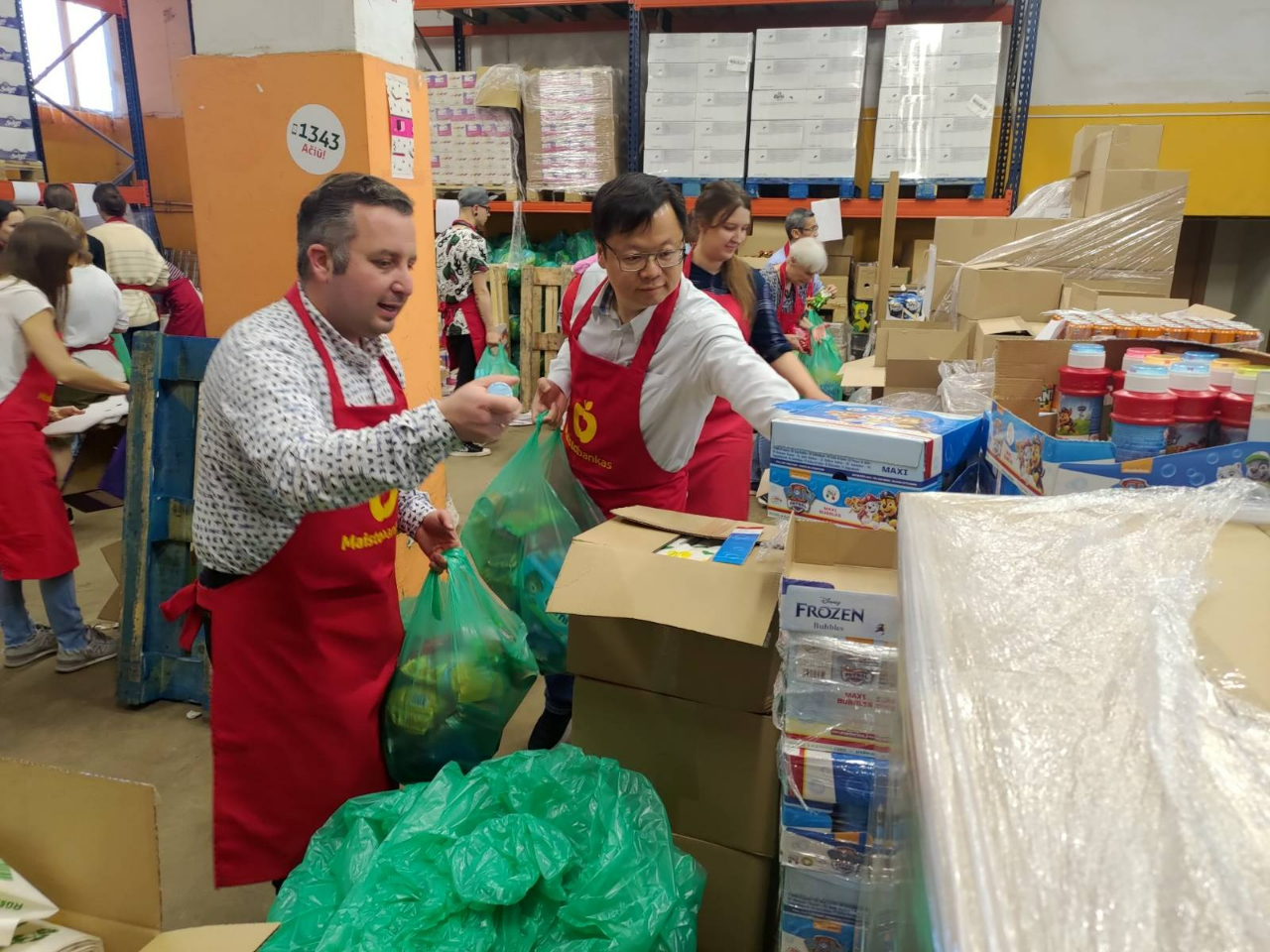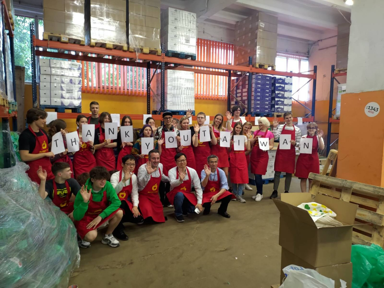 駐立陶宛代表黃鈞耀在68日下午拜訪「立陶宛食物銀行」(MaistoBankas),代表我政府將台灣民眾賑濟烏克蘭難民所捐善款之50萬美元,捐贈予該公益組織。該組織執行長居里維休斯(Simonas Gurevičius)代表接受。居里維休斯執行長表示,感謝來自台灣的愛心,該組織會將來自台灣的善款,用於採購食品並分裝成袋,透過兒童食品專車,分贈在立陶宛各城市共約2萬名的烏克蘭兒童難民。黃代表並與居里維休斯執行長共同協助包裝食品袋,並與在場手持「感謝台灣(Thank you Taiwan)」文字,參與分裝食品的義工合影。