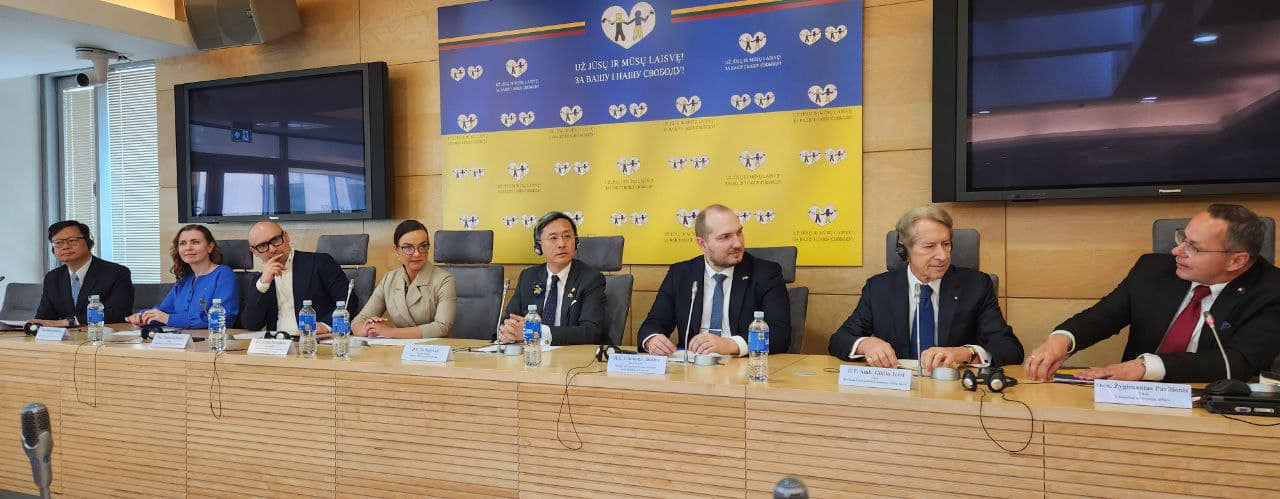 圖說:李淳次長應立陶宛國會外交委員會主席Žygimantas Pavilionis(右一)及友台小組主席Matas Maldeikis(左三)邀請,出席在立陶宛國會舉辦的「前線民主國家支持烏克蘭研討會」。