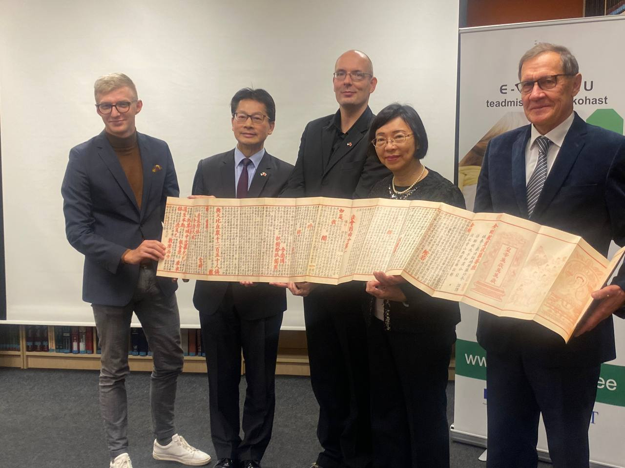 李大使、愛國友台小組裴克多主席(左一)、愛國留台校友會會長李特(中)、曾館長與塔林大學學術圖書館Kollist館長共同展示古籍復刻圖書《金剛般若波羅蜜經》