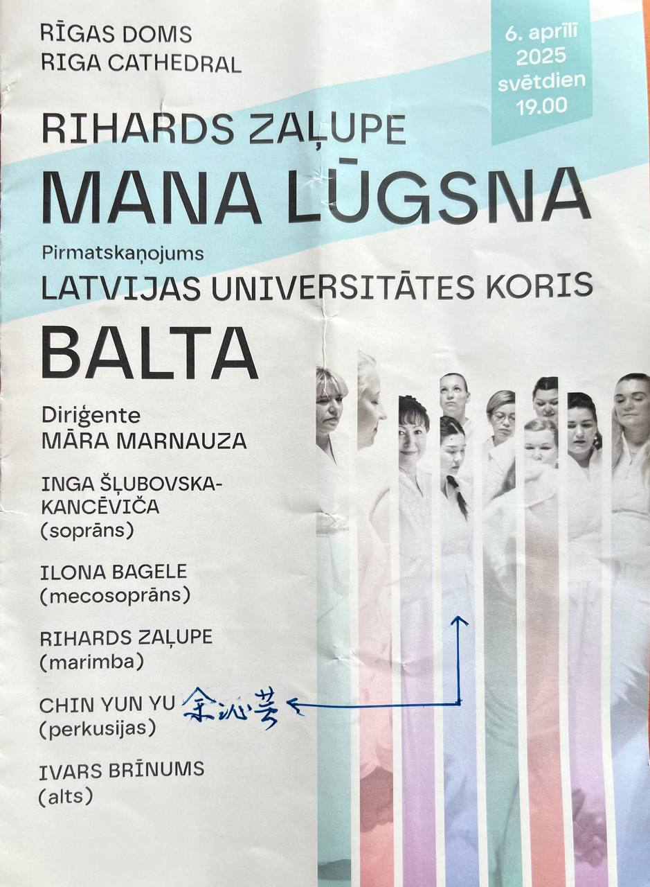「我的祈禱」係由月前獲得奧斯卡最佳動畫片之拉國動畫作品”Flow”背景音樂作曲家Rihards Zaļupe之最新力作,深受拉國社會矚目。參與樂曲演出者包括拉脫維亞大學女聲合唱團、著名女高音Inga Šļubovsja-Kancēviča、女中音、中提琴、馬林巴琴及打擊樂器;台灣音樂家余沁芸女士一人負責打擊樂器,深具演出份量,且表現出色。作曲家Zaļupe為凸顯余女士在打擊樂方面的才華與造詣,作曲當時特別在許多篇章強化打擊樂器的角色,此在西方宗教聲樂中頗為少見,亦為此一新作在神聖肅穆之餘,增添活潑及明亮色彩,與會拉國友人對此印象深刻,並於演出後紛與余小姐合照,為台拉文化及音樂交流寫下新的篇章。與會友人均認為,余女士透過打擊樂器為宗教音樂賦予新的風貌,不僅具有高度的音樂性,也融入明亮歡快的節奏,令人耳目一新。