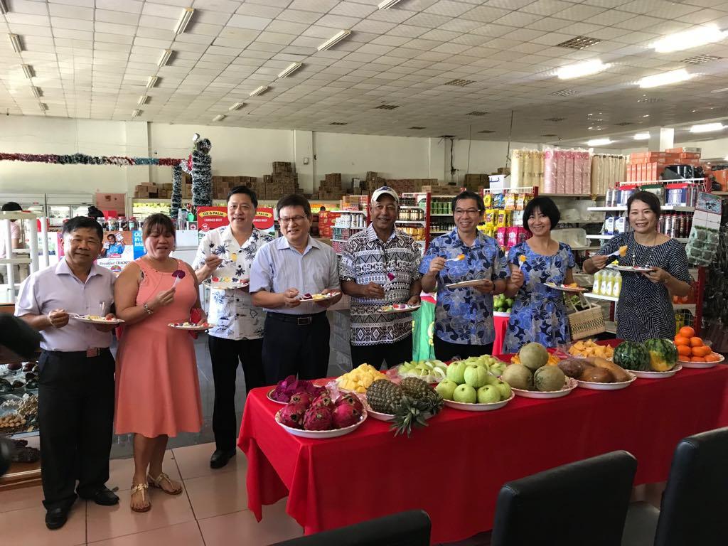 本館蕭大使勝中夫婦於本(108)年6月11日應此間台商「福爾摩沙超市」(Formosa Supermarket)董事長林僑務促進委員學銘夫婦邀請出席進口台灣蔬果品嚐活動,馬國主管農業及防檢疫之天然資源暨商務部部長Dennis Momotaro偕次長Iva Roberts-Reimers等官員及本館高秘書文杰、林秘書志華及技術團林團長彥仁等亦均應邀與會,過程溫馨順利。與會賓客在品嚐該超市進口之新鮮台灣蔬果後,均表印象深刻,亦對我國政府及民間與馬國合作促進糧食安全及提供民眾飲食多樣化選擇之努力給予肯定,Dennis Momotaro部長表示,進口台灣蔬果到馬國具有重要意義,盼能永續經營並獲得馬國消費者的歡迎。蕭大使表示,盼臺馬雙方共同努力,促成未來馬國椰子等農產品亦能出口至我國。