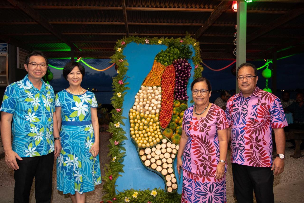 蕭大使夫婦與馬國海妮總統伉儷於會場以臺灣蔬果裝飾之臺灣模型前合影