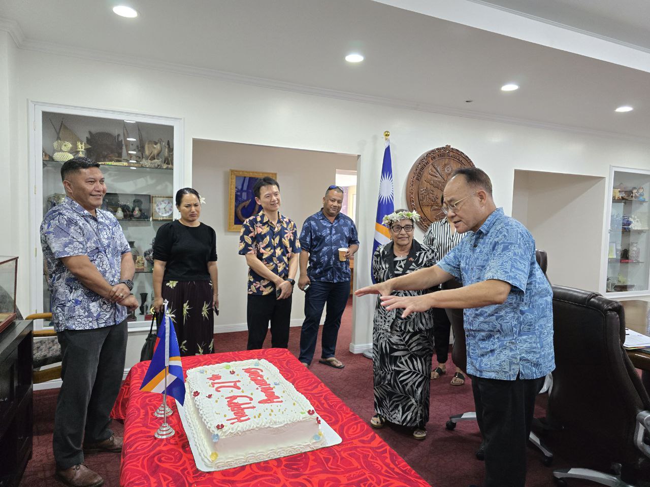 今(11月27日)日是台灣及馬紹爾群島建交27週年,本館劉臨時代辦漢清與馬國總統海妮(Hilda Heine)及外貿部長康仁德(Kalani Kaneko)一同切蛋糕慶祝。 兩國建交27年以來,雙方在農漁業、公共衛生、教育、婦女賦權、潔淨能源、基礎建設等領域不斷深化和合作。 感謝馬紹爾群島一路相挺,期待未來持續共同創造更美好的未來!