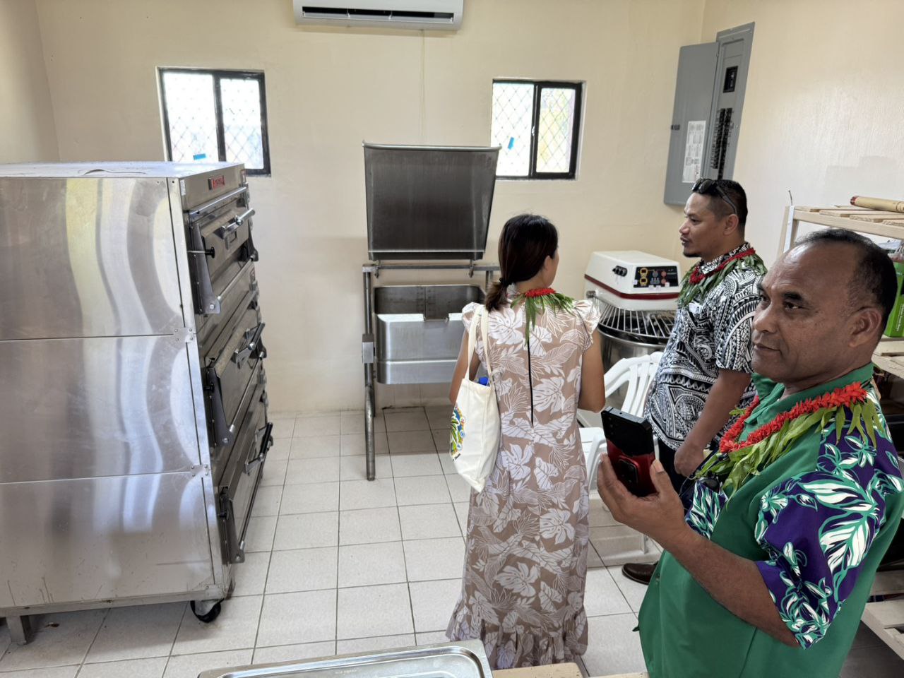 北島高中廚房翻修時,我國透過財團法人國際合作發展基金會提供商用烤箱、攪拌機、多功能炒菜機,以及駐馬技術團的廚務訓練與校園農園指導,全力協助 NIHS 提升供餐品質。商用烤箱一次可烘烤 144 份南瓜麵包,大幅提升效率;多功能設備也讓學校能運用更多新鮮在地蔬菜,打造更均衡的餐點。
