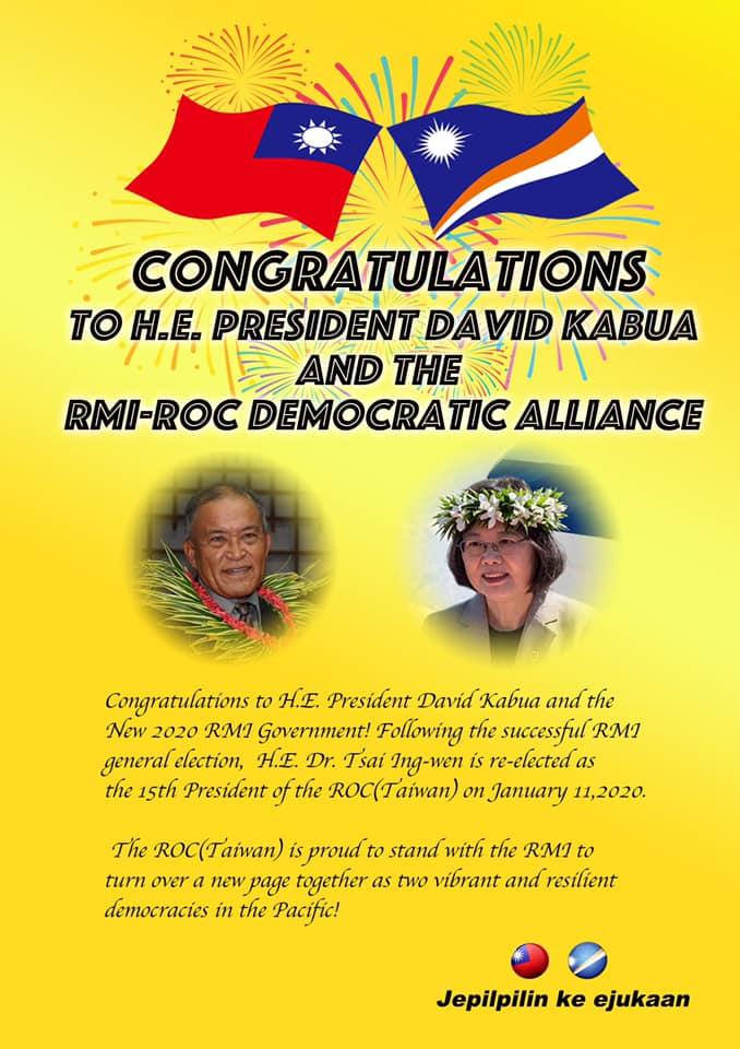 Congratulations to H.E. President David Kabua and the New 2020 RMI Government! Following the successful RMI general election, H.E. Dr. Tsai Ing-wen is re-elected as the 15th President of the ROC(Taiwan) on January 11,2020.