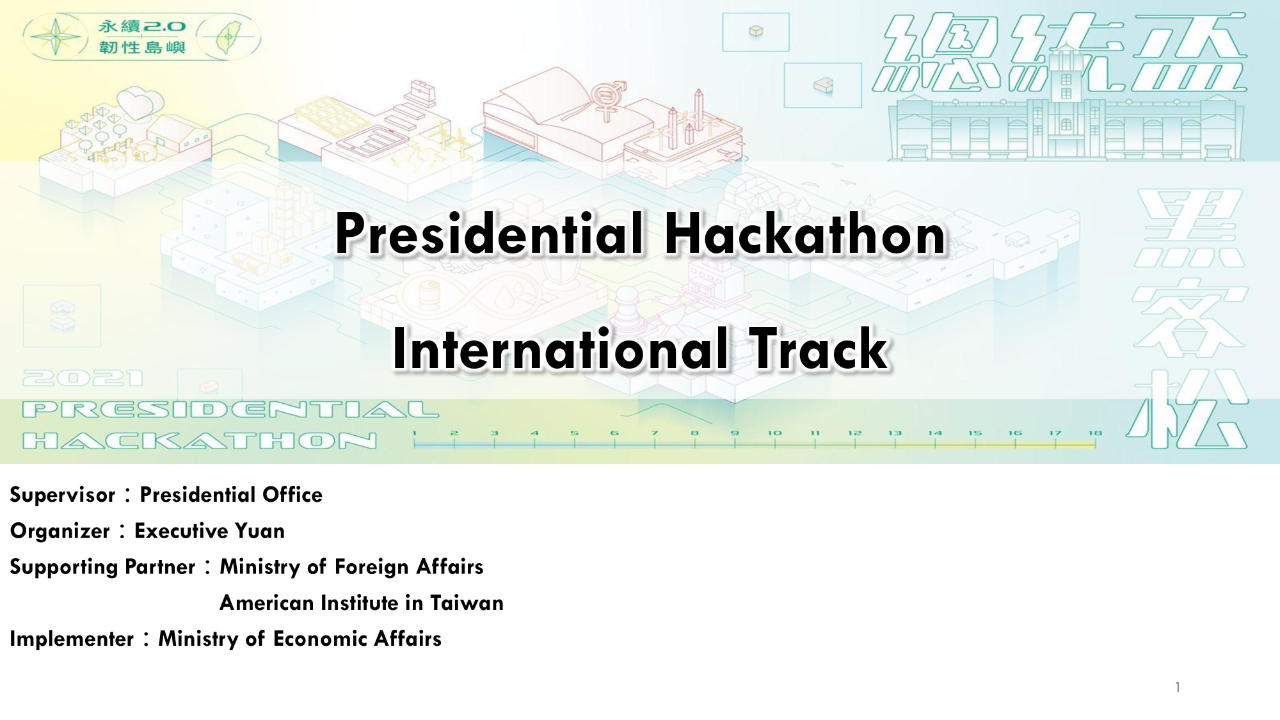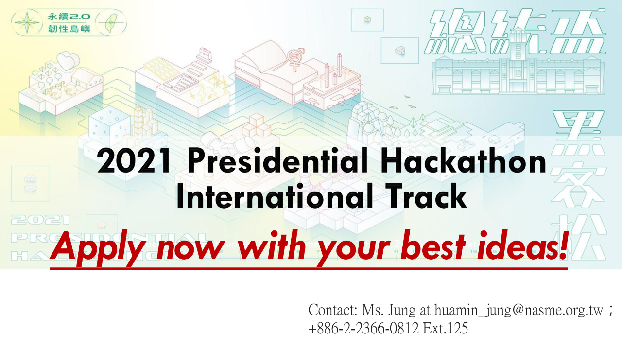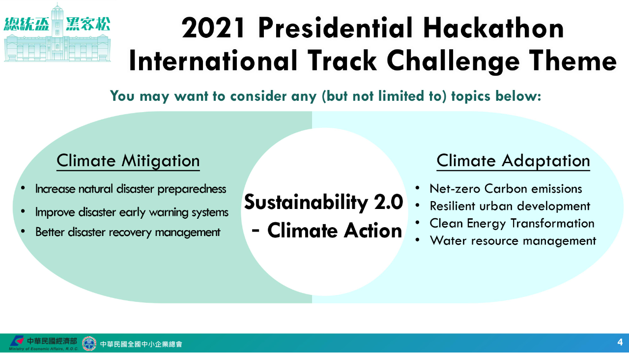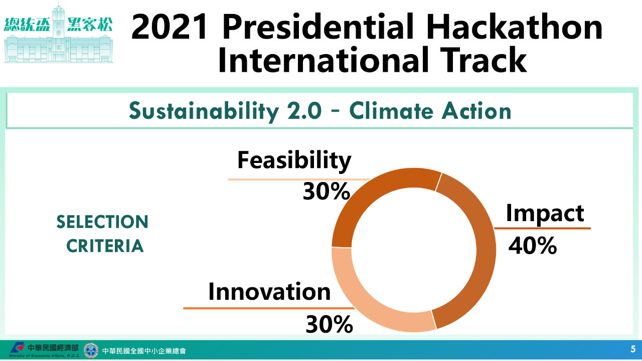 Hence, this year (2021), under the theme of “Sustainability 2.0 Resilient Islands,” you are invited to utilize Taiwan’s digital competitiveness from the perspective of national sustainable development through the private and public partnership to participate in this hackathon challenges in issues including “Human Capital,” “Circular Economy,” “Energy Transformation and Decarbonization,” “Sustainable Food, Agriculture, and Ecological Conservation,” “Smart Resilient Cities and Counties,” “Digital Transformation,” to discover solutions and to work hand in hand to build Taiwan into a resilient islands.