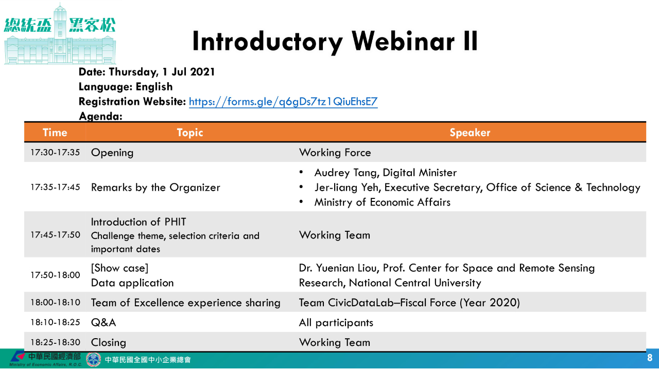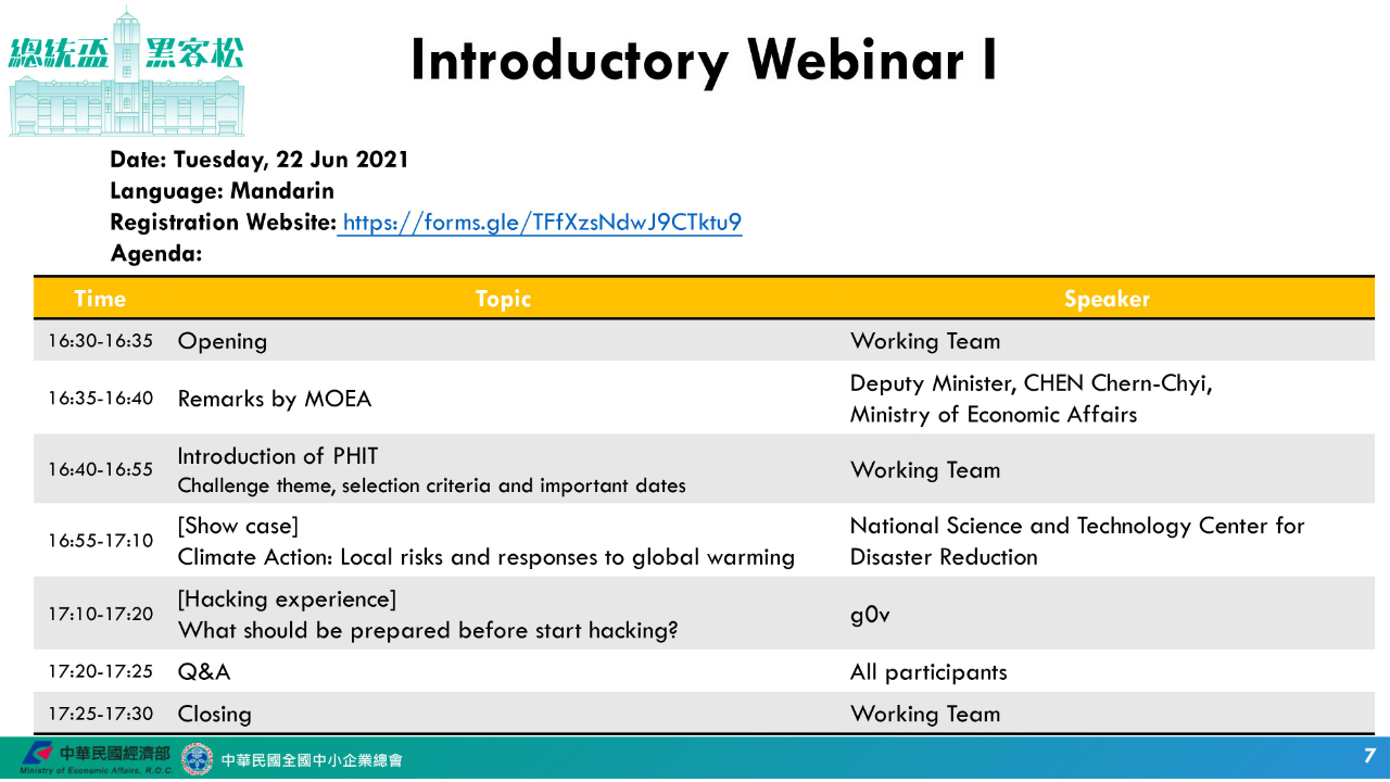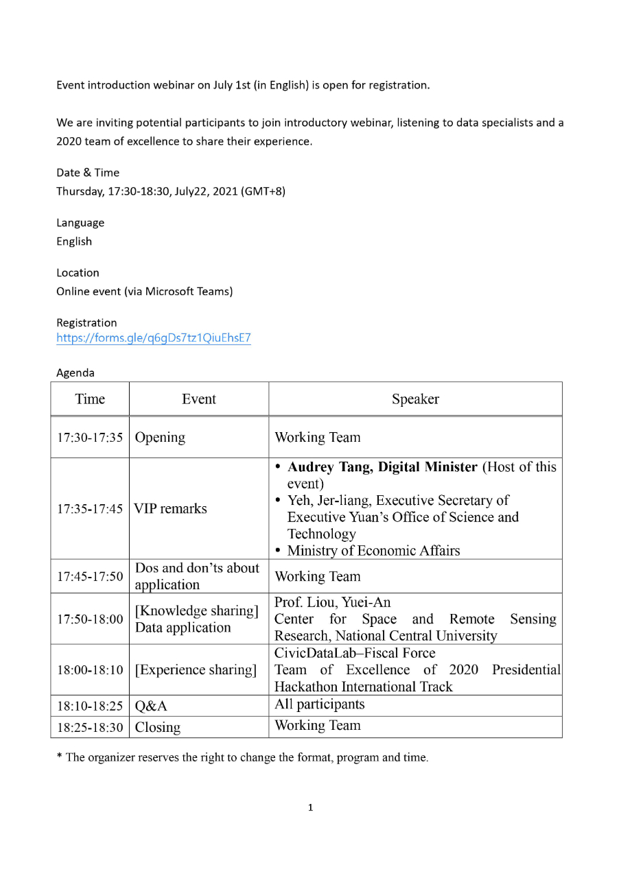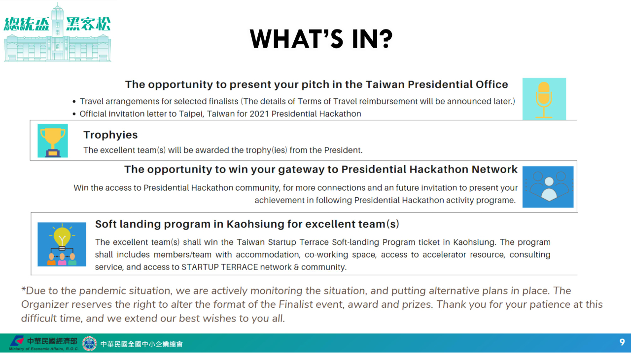 Hence, this year (2021), under the theme of “Sustainability 2.0 Resilient Islands,” you are invited to utilize Taiwan’s digital competitiveness from the perspective of national sustainable development through the private and public partnership to participate in this hackathon challenges in issues including “Human Capital,” “Circular Economy,” “Energy Transformation and Decarbonization,” “Sustainable Food, Agriculture, and Ecological Conservation,” “Smart Resilient Cities and Counties,” “Digital Transformation,” to discover solutions and to work hand in hand to build Taiwan into a resilient islands.