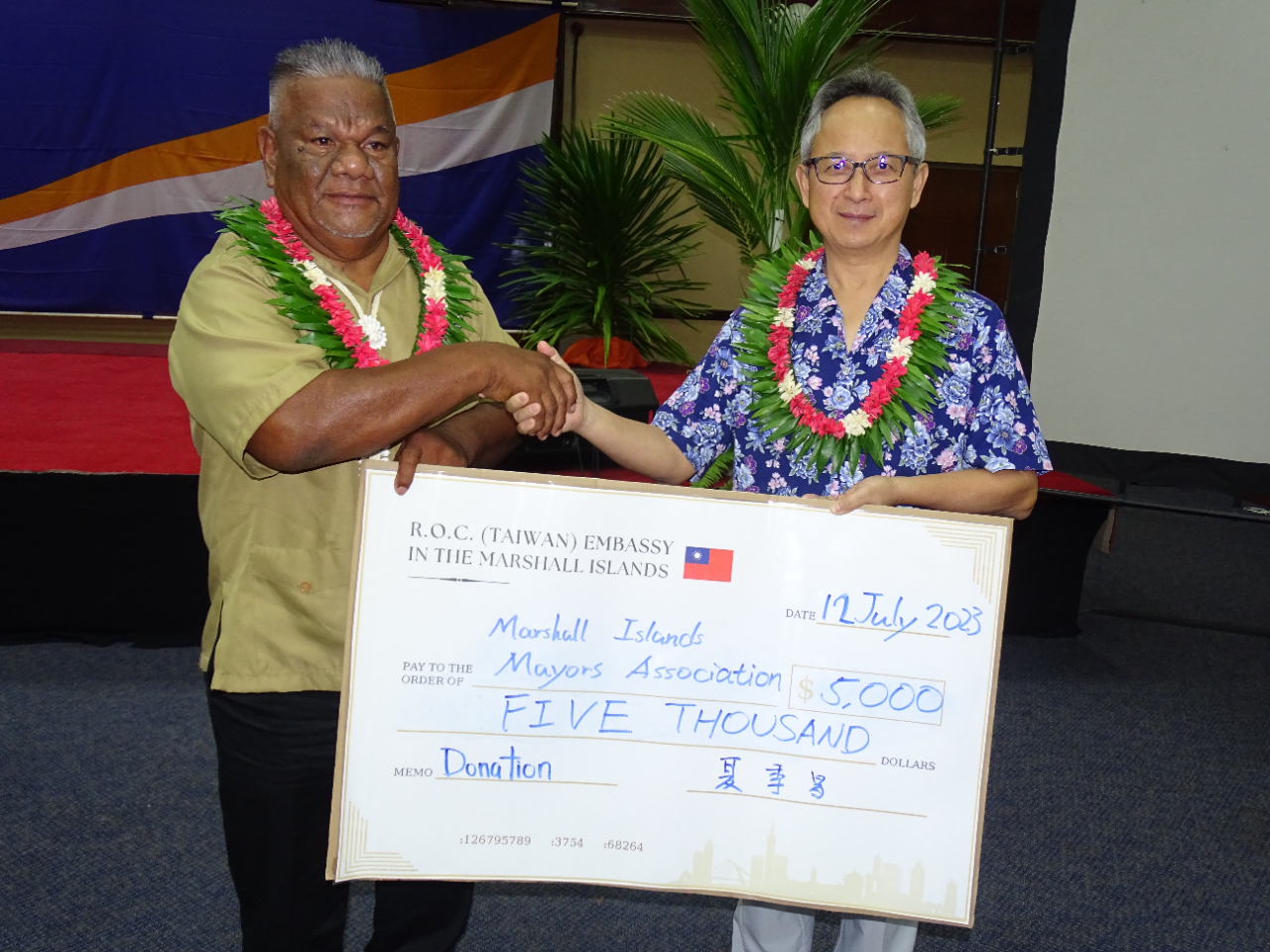 On July 12th, 2023, Ambassador Hsia attended the opening of the 32nd Marshall Islands Mayors Association Conference, where he, on behalf of the Government of the Republic of China (Taiwan), donated 5,000 USD to support the Mayors’ efforts in enhancing the development of their atolls and islands via brainstorming in the conference. The Embassy has high expectations for the success of the annual conference, leading to productive outcomes that will benefit the people from all atolls and islands in the Marshall Islands.