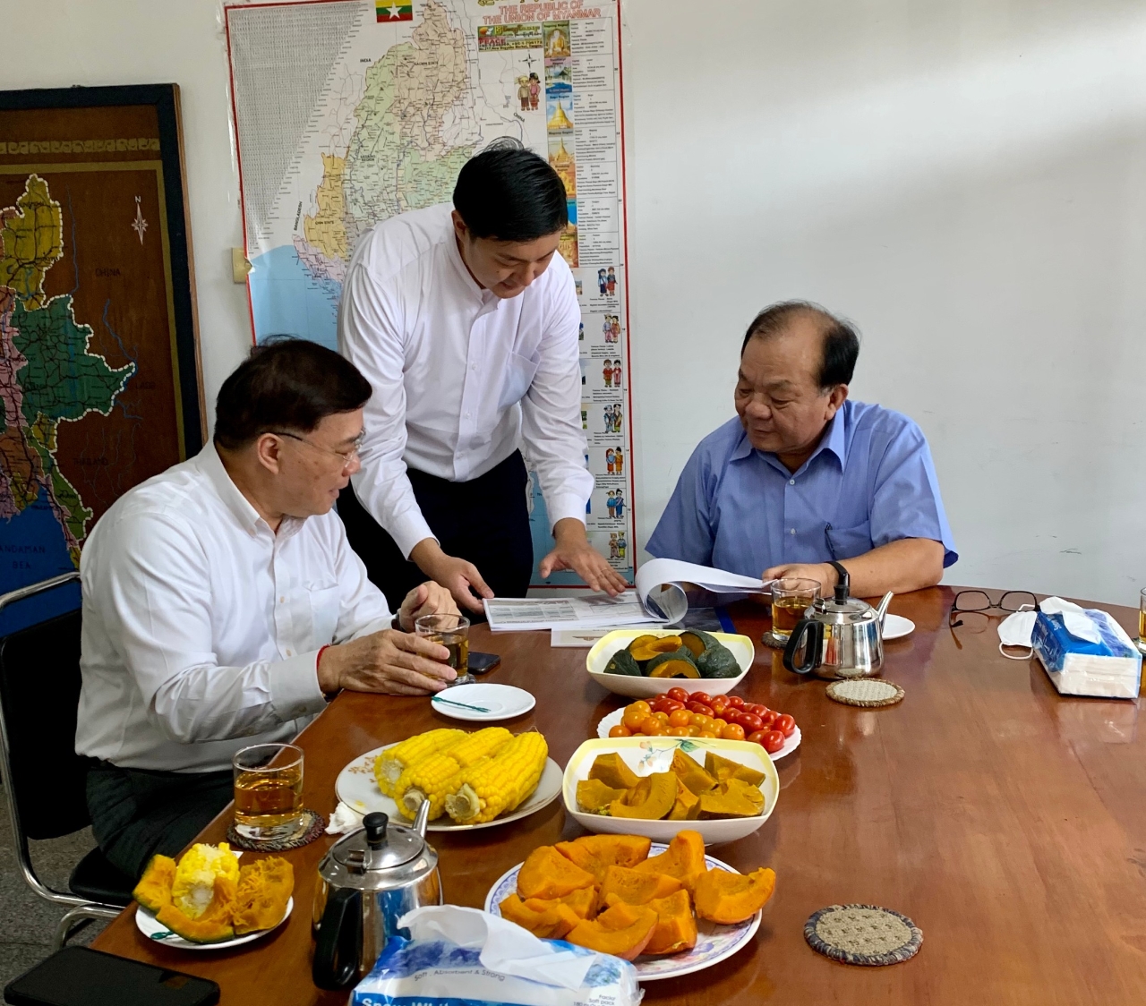 為對接台商與緬甸大型企業之合作,駐緬甸代表處李朝成大使3月8日上午引介緬甸寶運集團(Myanmar Jewellery Luck Group)副董事長Tin Tun Oo與農友種苗(緬甸)公司郭坤石總經理,雙方針對業務專長、合作機會及中長程規畫充分交換意見。