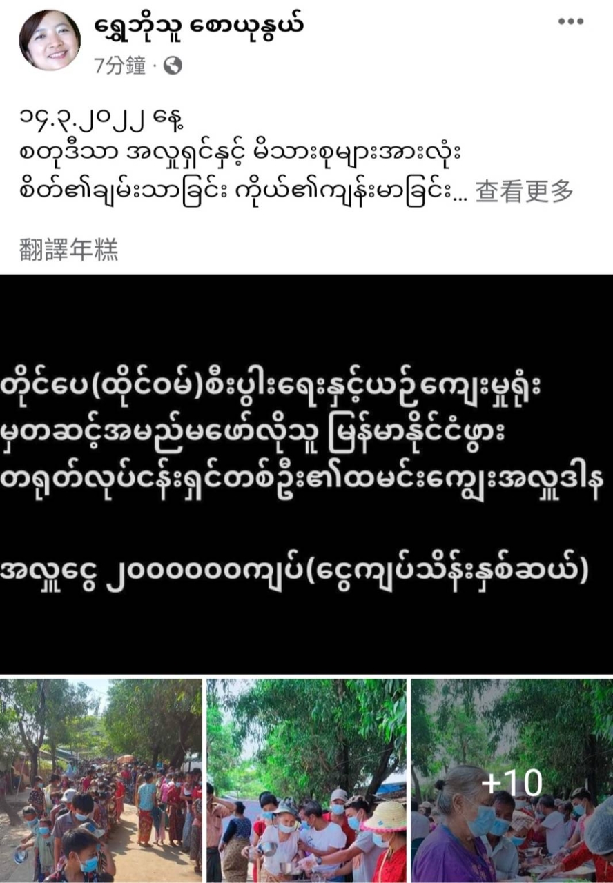 為協助渡過困境,駐緬甸代表處在3月14日再一次協助一位匿名善心僑商贊助1500份午餐,提供給 Dagon Seik Kan 鎮區的弱勢居民享用。駐緬甸代表處感謝這位僑商主動大方捐輸,用愛心與慈悲將善的循環回饋在緬甸民眾身上。李大使樂見旅居緬甸的臺商、僑商友人,以各自認為合宜的方式,協助緬甸全境弱勢社區居民、孤兒院、學校等,紓解三餐不繼的窘境。