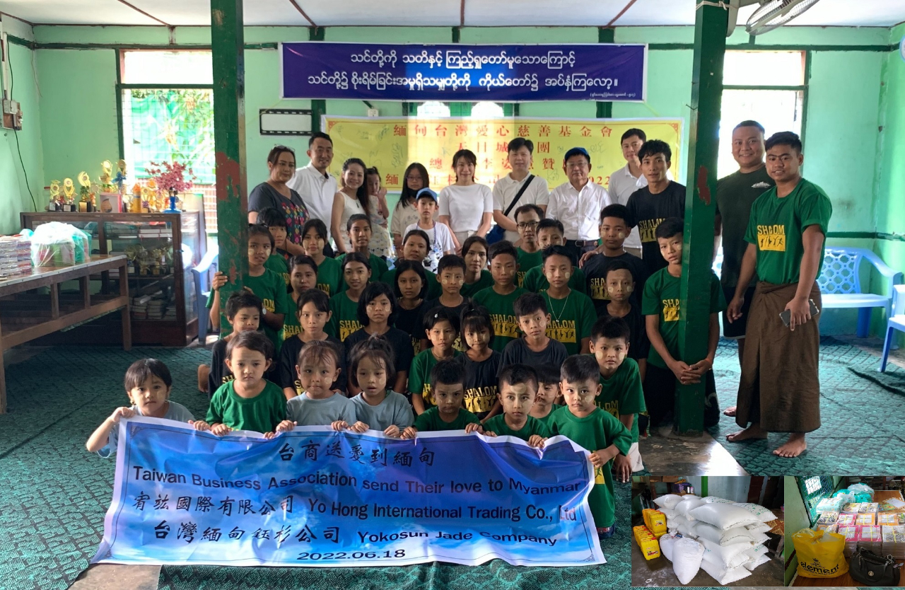緬甸臺灣商貿慈善基金會、緬甸鈺杉公司、宥竑國際有限公司、臺灣天目城集團聯合向SHALOM孤兒院捐贈善款與物資(圖左下)。