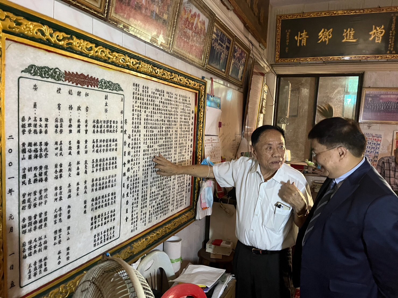 呂會長向李大使介紹緬甸福建同鄉總會創建歷程,最早會址於1861設立於慶福宮內,160餘年來持續團結鄉親在緬甸這塊土地生根打拼,目前總會轄下約有50多個宗親、地方社團,2000年由呂會長匯聚群力購買Sinn O Dan St.會館現址。2001年於會館內成立福星學校,由於仰光學習華文的人數越來越多,華文學習有其重要性,現已在仰光Ahlone區開始新建校舍。