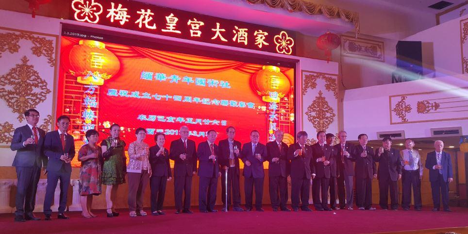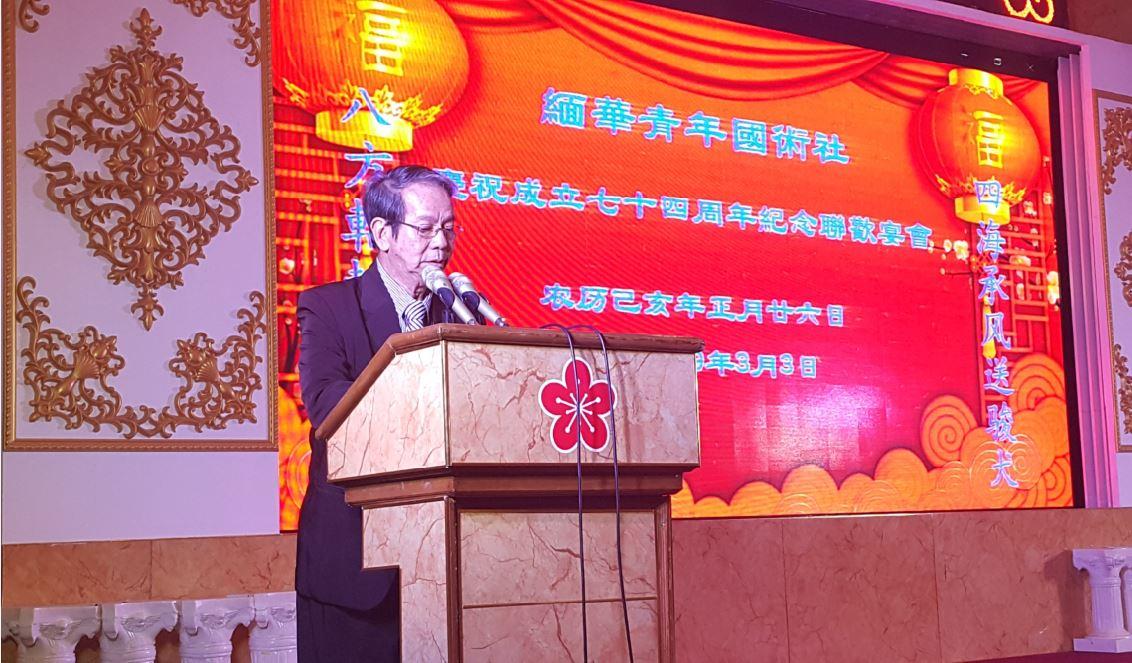 緬華青年國術社3月2日晚間在仰光梅花皇家海鮮餐廳歡慶成立74週年,駐緬甸代表處代表張俊福、僑務組組長張文華、緬華各僑團代表四百多人到場祝賀,氣氛熱絡。