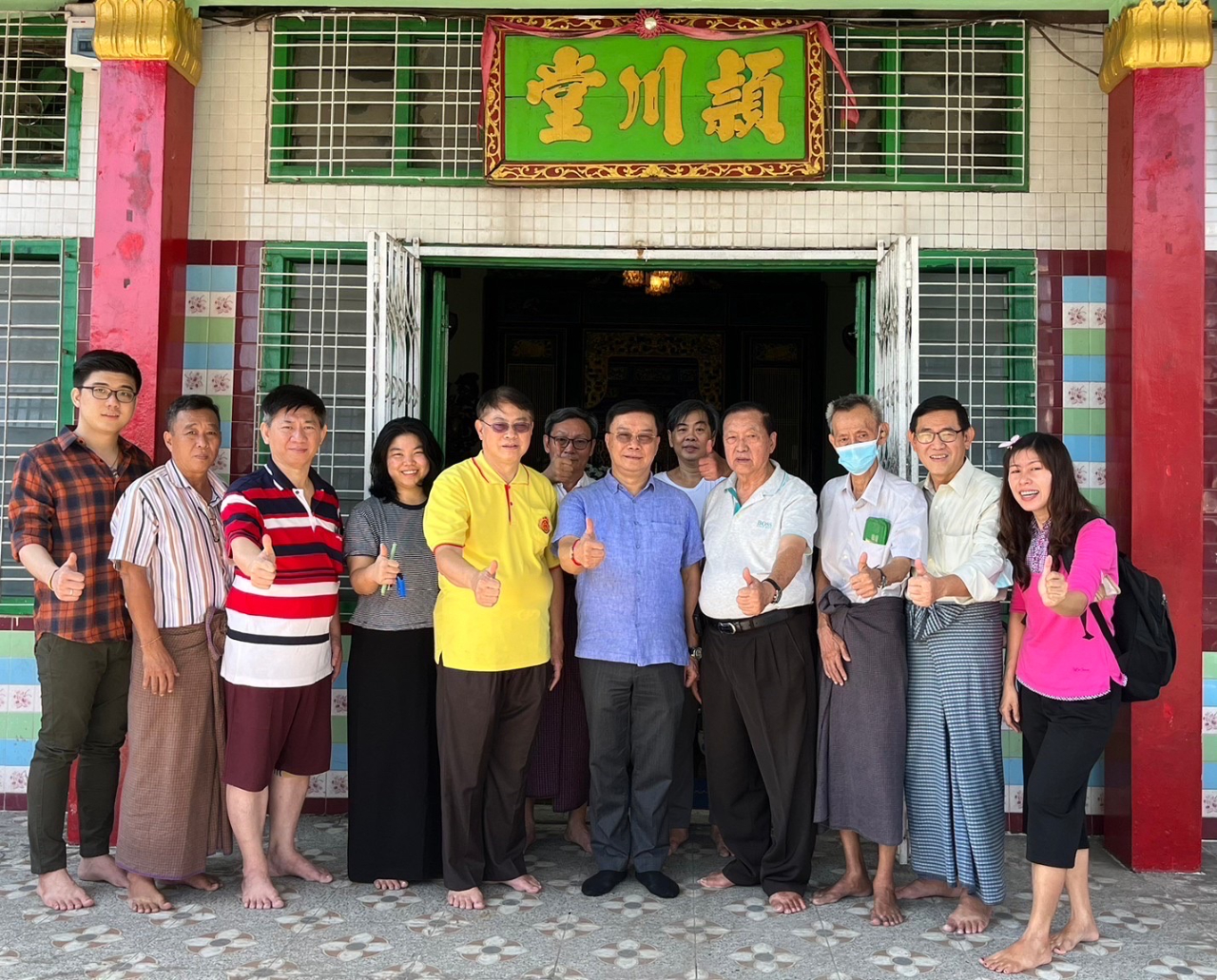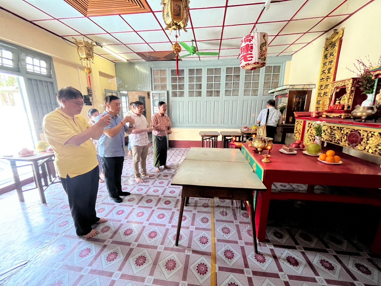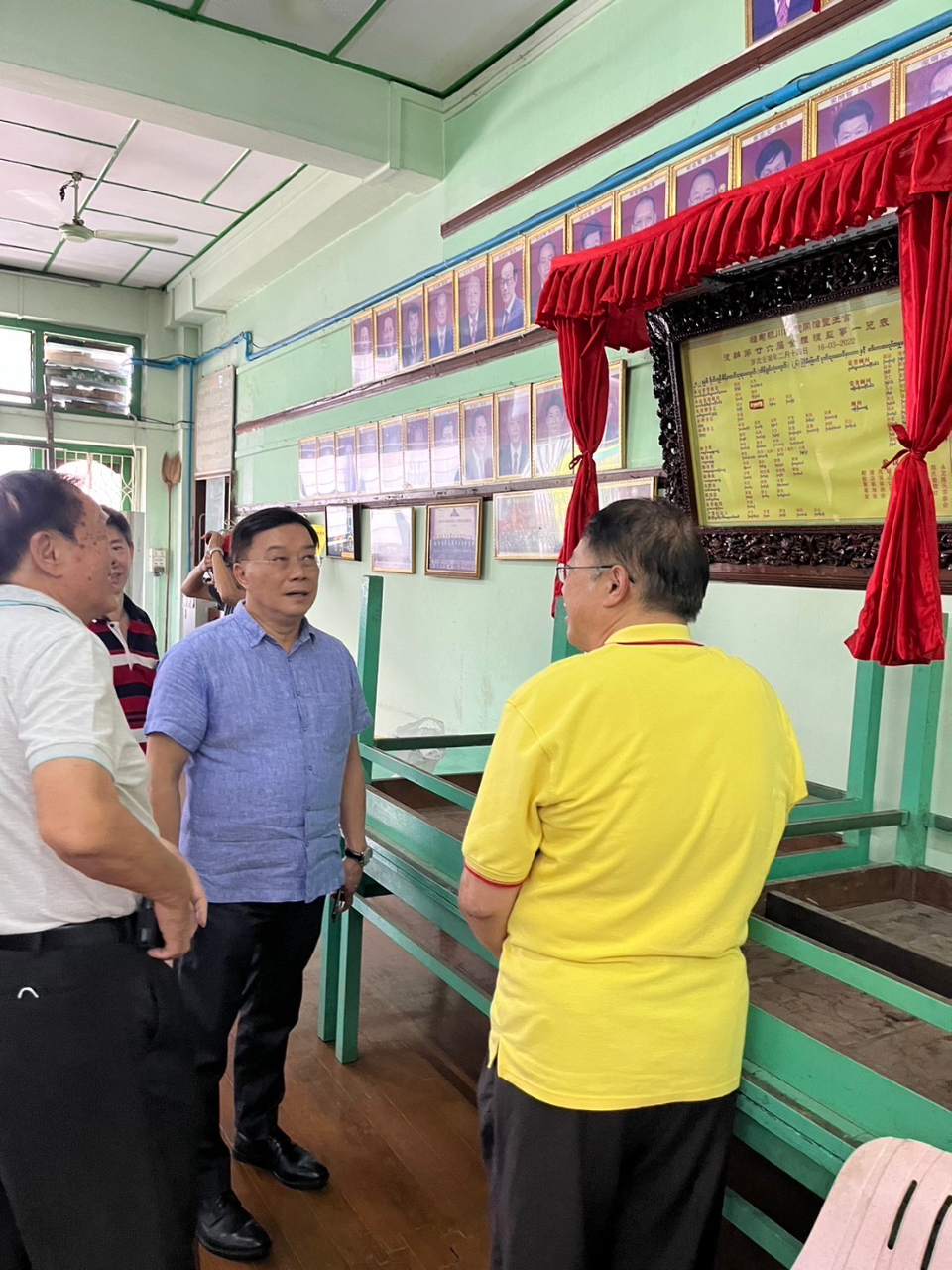 駐緬甸代表處李朝成大使12月11日(星期日)中午先後拜會緬甸陳氏大宗祠潁川總堂與舜帝廟,受到陳庚銘永遠榮譽理事長、陳世富理事長等多位總堂幹部熱烈歡迎。陳氏宗親們為李大使親切導覽,詳細解說緬甸潁川總堂現址創設於清道光二十六年、西元一八四六年,已歷一百七十六年! 堂址樓上供奉開漳聖王祖,李大使在永遠榮譽理事長、理事長等陳氏宗長陪同之下,向開漳聖王焚香禮拜。李大使嗣轉赴潁川總堂所屬的舜帝廟上香致敬,並參訪妙善華文補校,隨後與陳氏宗親們共同享用鄉親所贊助獨特風味的福建美食。