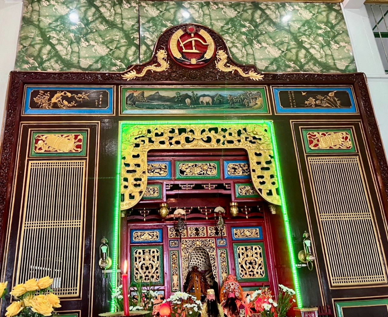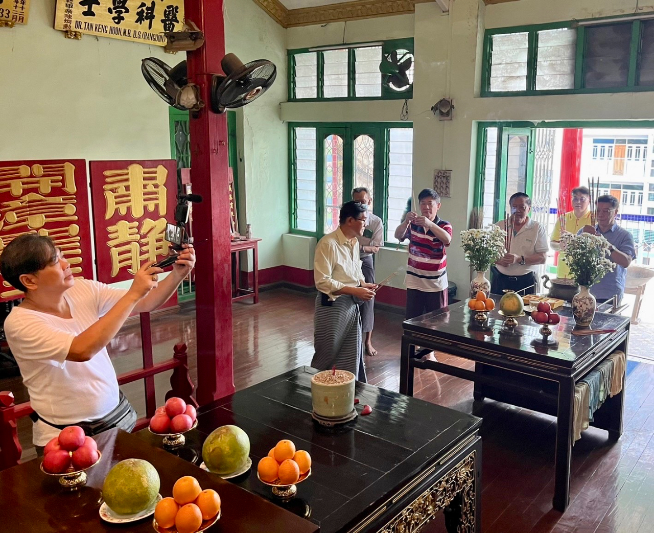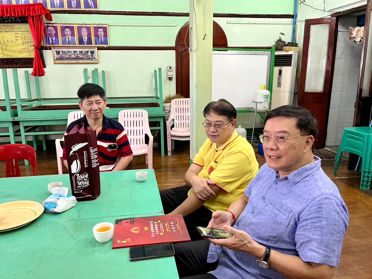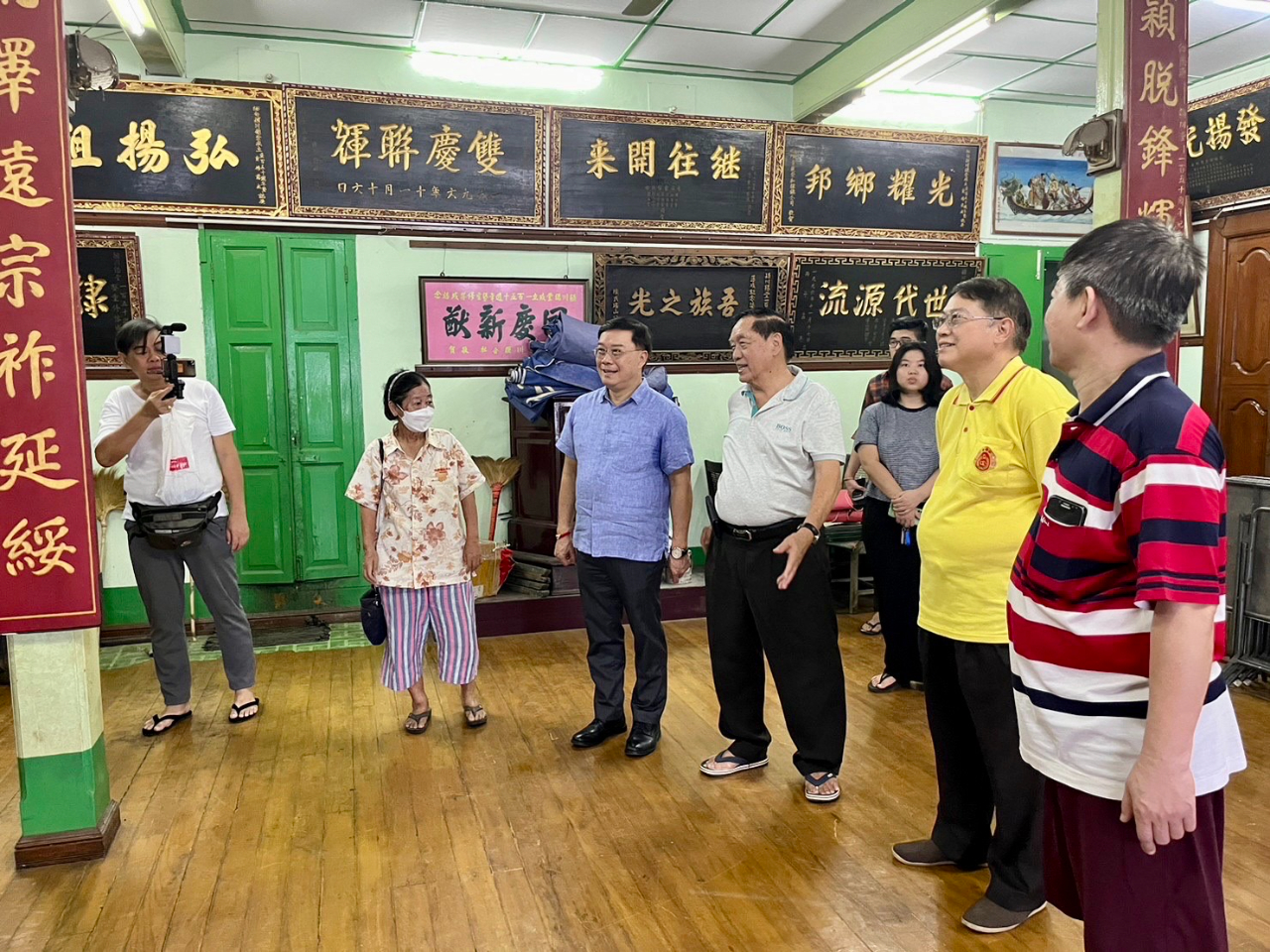 駐緬甸代表處李朝成大使12月11日(星期日)中午先後拜會緬甸陳氏大宗祠潁川總堂與舜帝廟,受到陳庚銘永遠榮譽理事長、陳世富理事長等多位總堂幹部熱烈歡迎。陳氏宗親們為李大使親切導覽,詳細解說緬甸潁川總堂現址創設於清道光二十六年、西元一八四六年,已歷一百七十六年! 堂址樓上供奉開漳聖王祖,李大使在永遠榮譽理事長、理事長等陳氏宗長陪同之下,向開漳聖王焚香禮拜。李大使嗣轉赴潁川總堂所屬的舜帝廟上香致敬,並參訪妙善華文補校,隨後與陳氏宗親們共同享用鄉親所贊助獨特風味的福建美食。